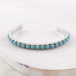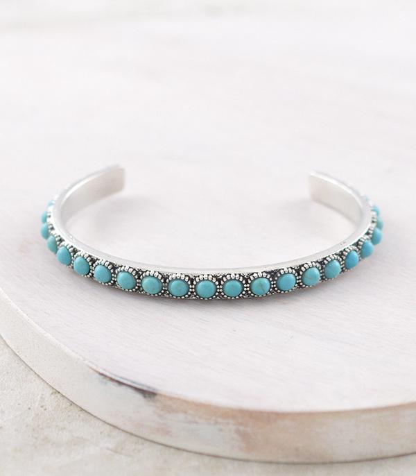 This turquoise semi stone bracelet brings natural color and bold western character in a clean cuff silhouette. The open cuff design makes it easy to slip on, while the turquoise-toned stones add timeless western appeal. A statement piece that stands strong on its own or pairs effortlessly with layered jewelry.