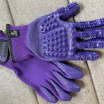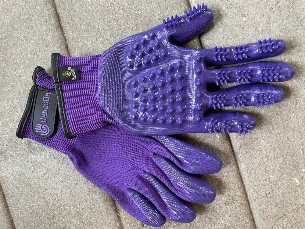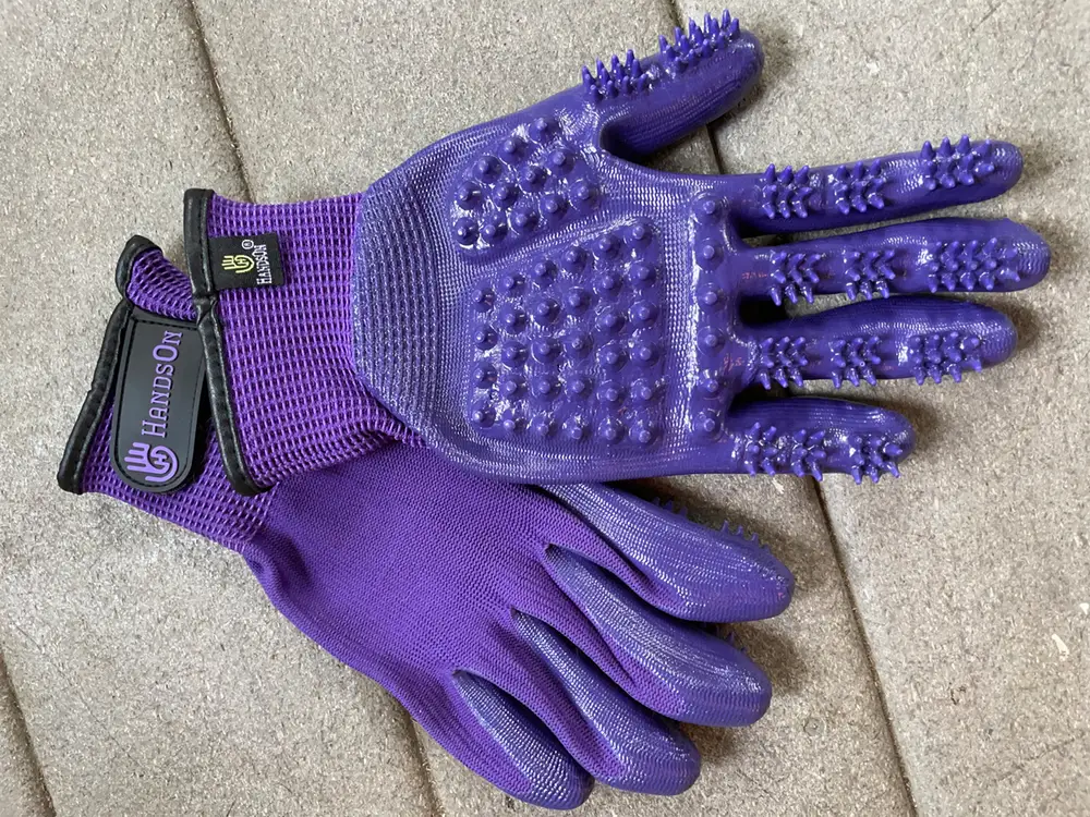 The HandsOn Grooming Gloves offer a smooth, flexible feel with gentle scrubbing nodules that lift dirt, hair, and dander while giving your horse or pet a relaxing massage. Their contoured, slip-resistant design molds to your hands, making grooming feel natural, efficient, and enjoyable.