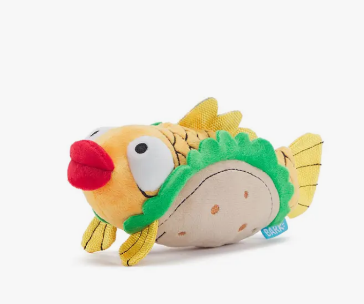 This fish taco dog toy is a fresh catch for playtime. Designed for long-lasting play, Ernesto's Fish Taco has whip-n-flip fins stitched from ballistic nylon, while the embroidered body is covered in soft but strong plush fuzz that dogs love to sink their teeth into. A giant tube squeaker is stuffed inside for a deep squeak that's easy on the ears (but still crazy-exciting for your dog). Whether they're relaxin' on the beach or chowing down on the boardwalk, they'll love what Ernesto has to offer!