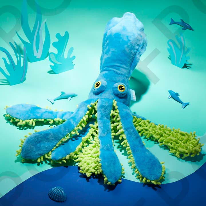 Product Details: Shifty Sid the Squid plush dog toy featuring whip-n-flip legs for thrashing play, crazy crinkle material for audible texture, one large built-in squeaker for added excitement, and a lightweight plush construction ideal for interactive play. Perfect for summer, nautical, beach, swimming, and ocean-themed assortments with year-round appeal.