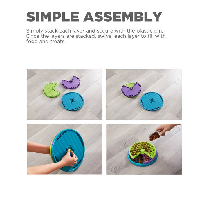 Product Details: Level 2 interactive dog puzzle toy from Nina Ottosson by Outward Hound; features three rotating layers with over 100 treat compartments for extended engagement; encourages problem-solving, mental stimulation, and natural instinctive behaviors; can be used as a slow feeder to help promote healthier eating habits; difficulty can be increased by freezing peanut butter (xylitol-free), wet food, or similar treats; made from food-safe plastic materials free from BPA, PVC, and phthalates.