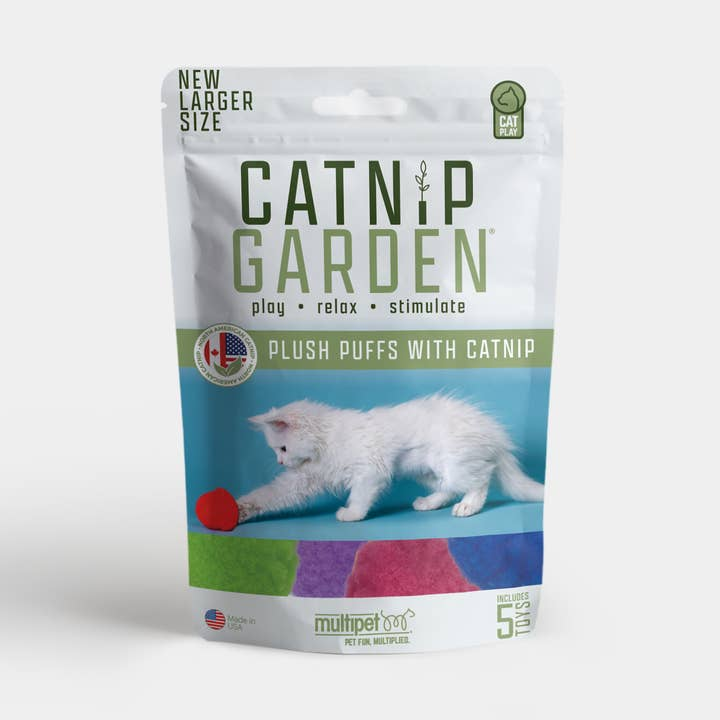 Product Details: Plush cat toy puffs infused with organic catnip; designed to encourage active play and exercise; durable construction for batting, tossing, and chasing; both the catnip and toys are made and grown in the USA.