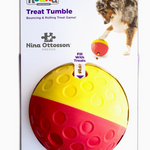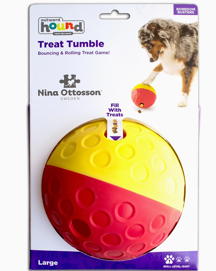 The Nina Ottoson Treat Tumble Ball is a perfect puzzle ball for any pup! A level 1 treat-dispensing dog puzzle, the Treat Tumbler will keep your dog intrigued as they roll the ball and sniff around to find ways to release the reward. Easy to fill with two treat-dispensing holes. Made with food safe BPA-free plastic that is easy to wipe clean for outdoor and indoor fun!