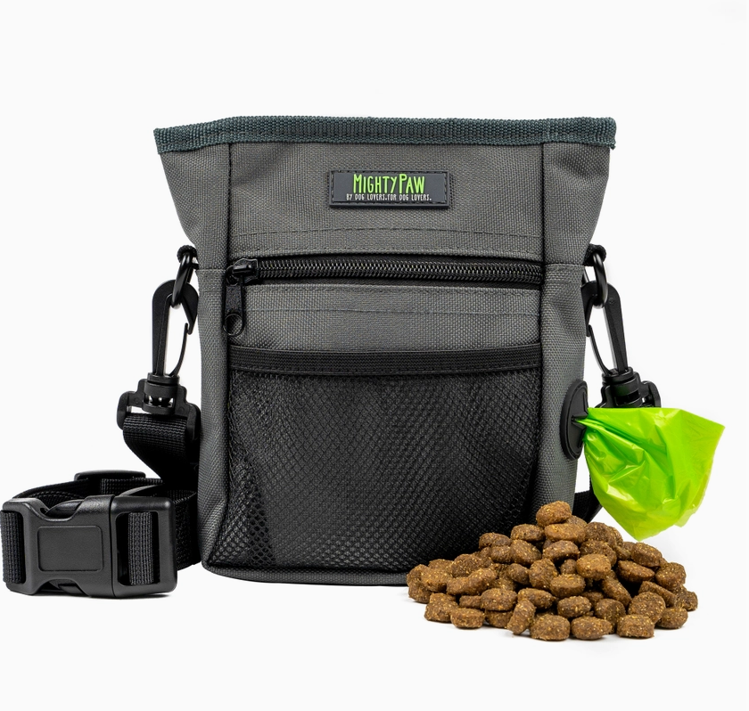 The Mighty Paw hands-free Dog Treat Pouch 2.0 measures 7" x 2.5" x 5" and includes 4 storage solutions!