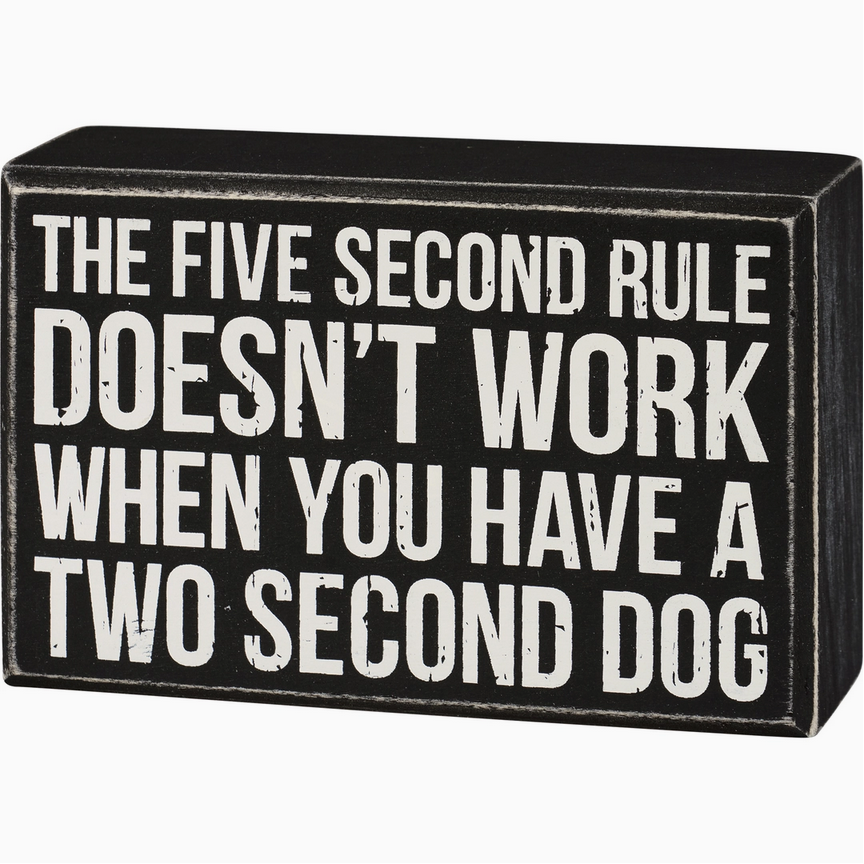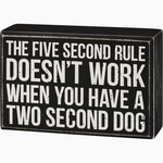 A classic black and white wooden box sign displaying a humorous sentiment that reads "The Five Second Rule Doesn't Work When You Have A Two Second Dog." Box sign features distressed details with coordinating black color on sides and back. Our Five Second Rule Doesn't Work box sign is easy to hang or can free-stand alone. A fun pet-themed home accent with a variety of display options.