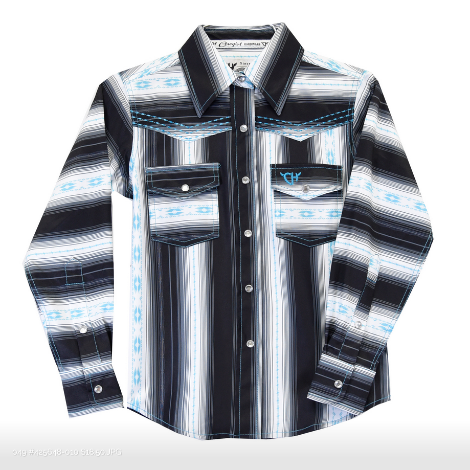 Saddle up in style with the Girl's Cowgirl Hardware Black Striped Serape Long Sleeve Print shirt! This eye-catching black and white western shirt features a vibrant blue and white pattern that adds a splash of color to any cowgirl's wardrobe, crafted for comfort and durability.
