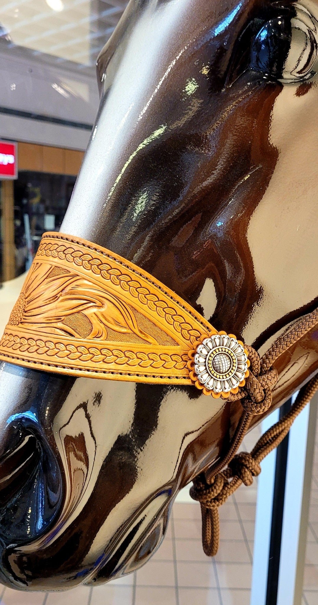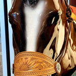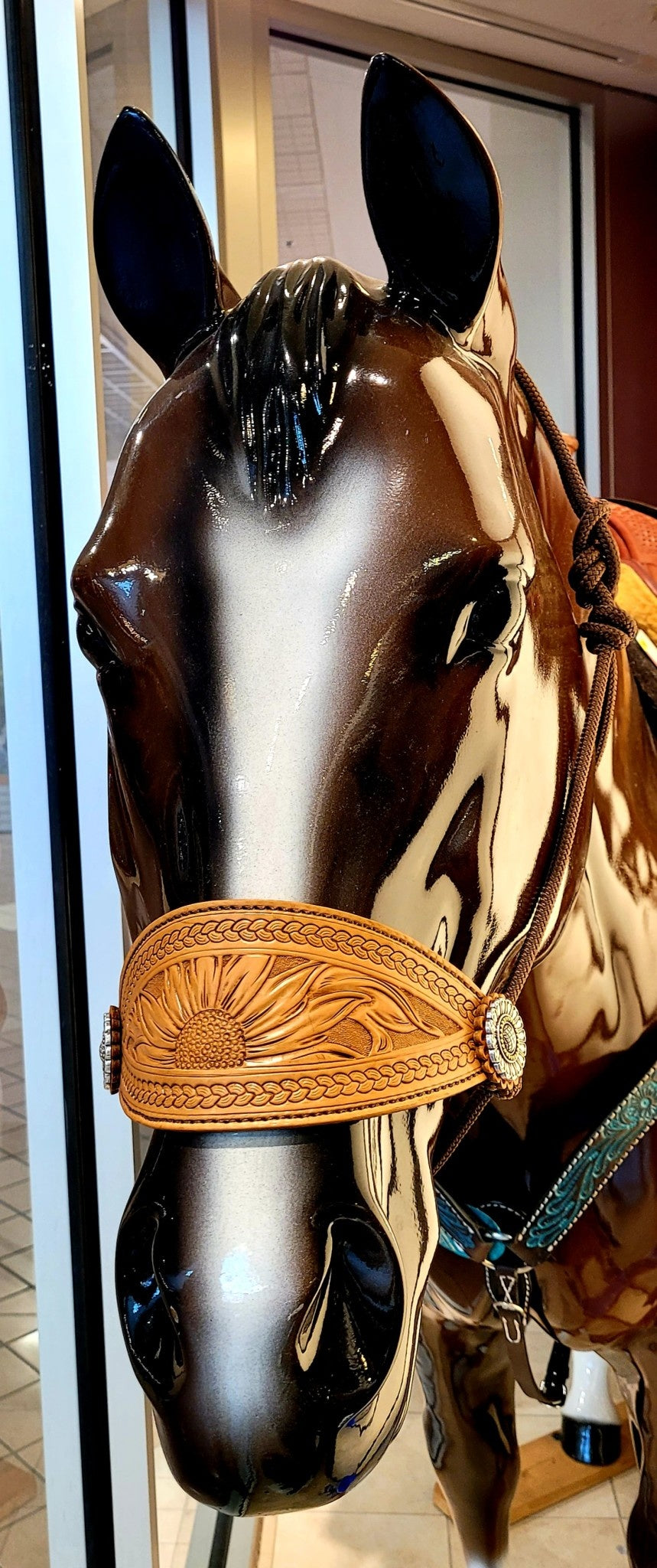 Hand-Tooled Full-Grain Leather Noseband: Features a unique sunflower motif, designed exclusively at Beyond the Barn.
