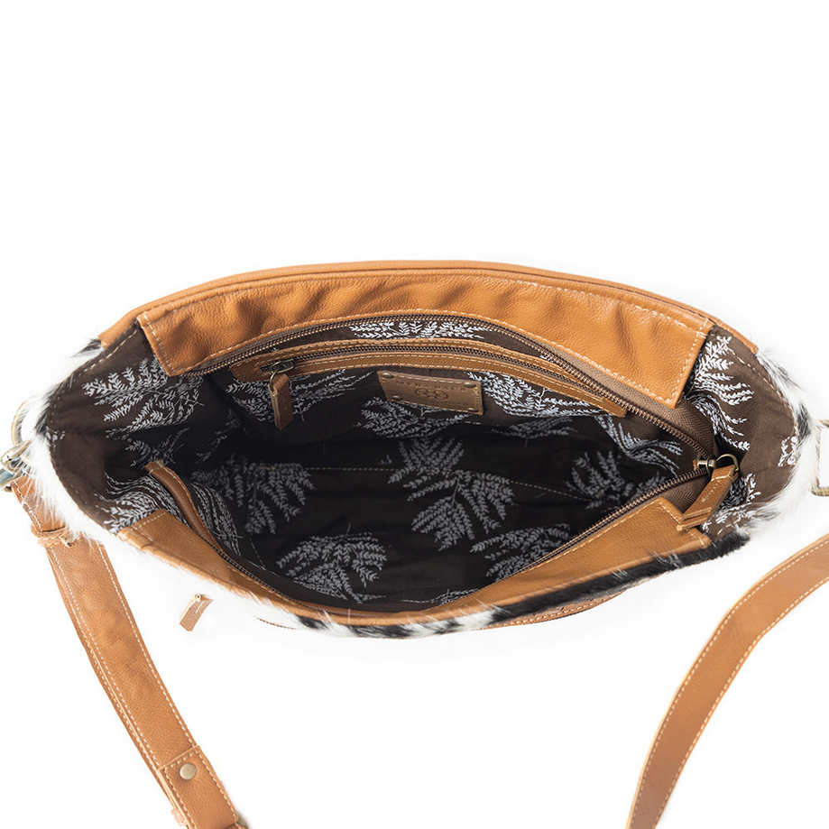 Experience the beauty of richly embossed leather paired with the tactile luxury of hair-on hide—an instantly eye-catching combination. The striking black-and-white cowhide pattern and intricate tooled details deliver that unmistakable ranch-to-city style fusion. Carry your confidence with you—this bold, untamed, yet functional bag is designed for the woman who owns every room she walks into.