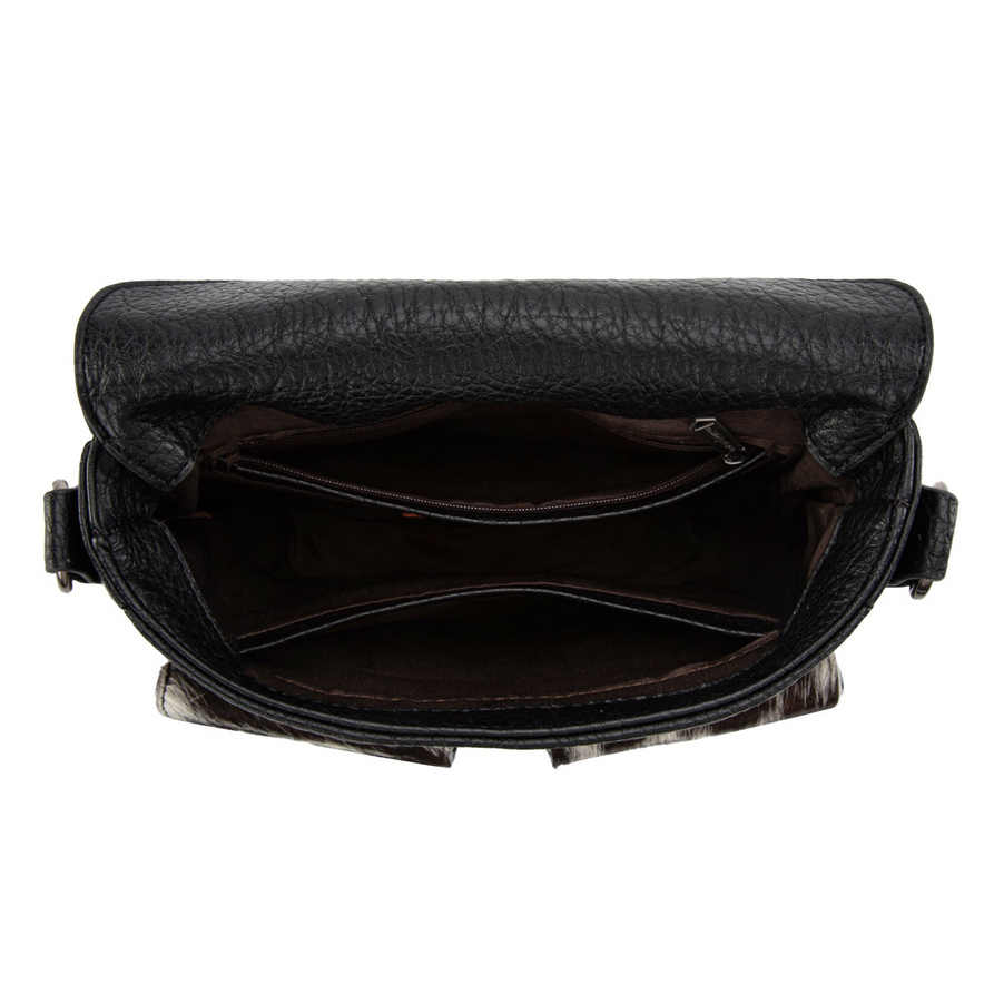 • Genuine hair-on cowhide front pocket