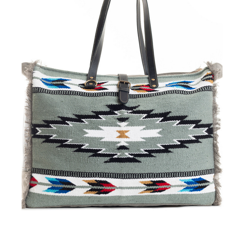 A stunning travel companion with vibrant tribal-inspired patterning, this upcycled rug bag feels rich with texture and artisan charm. Cloud gray canvas sides and back add a soft, earthy contrast, while matching leather straps and accents create a luxurious finish built to endure trips near and far. A bag made for the woman who refuses to travel unnoticed—confident, stylish, and always ready for her next adventure.