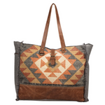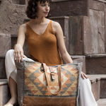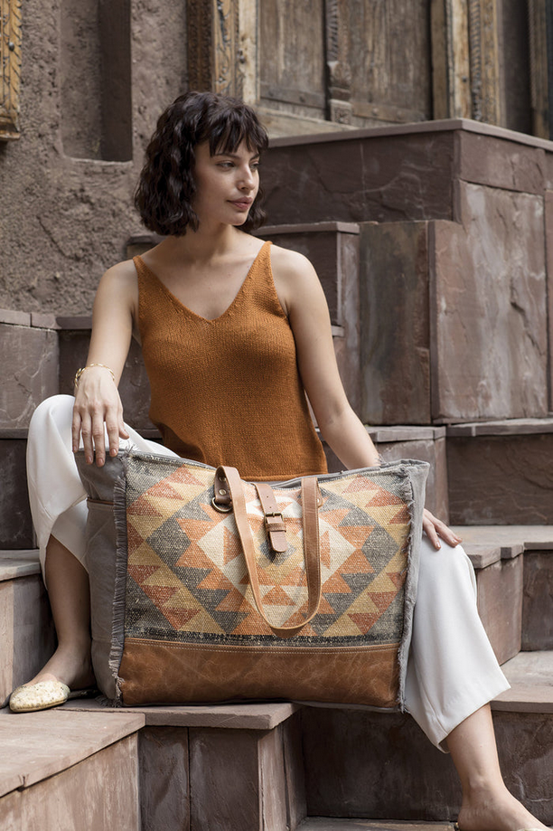 A grand multi-coloured weekend bag that feels rugged yet artfully vibrant, celebrating texture with every touch. Its striking rug-patterned exterior pairs beautifully with genuine leather reinforcement, giving it a sturdy and upscale presence perfect for travel. A bag that speaks to bold wanderers—those who pack adventure, spirit, and weekend dreams all in one place.