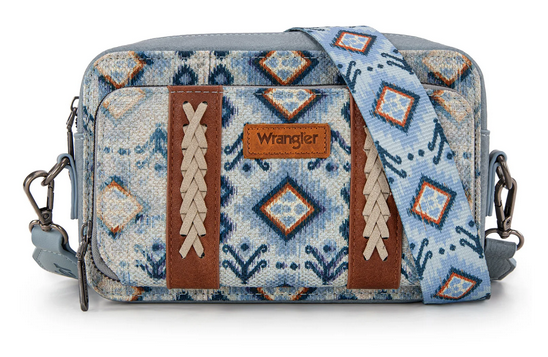 Feel the bold energy of the dual-sided Aztec Retro print as this Wrangler crossbody purse brings color, texture, and Western charm into every outing. The smooth canvas body is trimmed with detailed whipstitching, while the built-in wallet organizer keeps your essentials neatly arranged without adding bulk. Designed for women who love convenience wrapped in standout style, this compact bag delivers everyday functionality with unmistakable Wrangler personality.