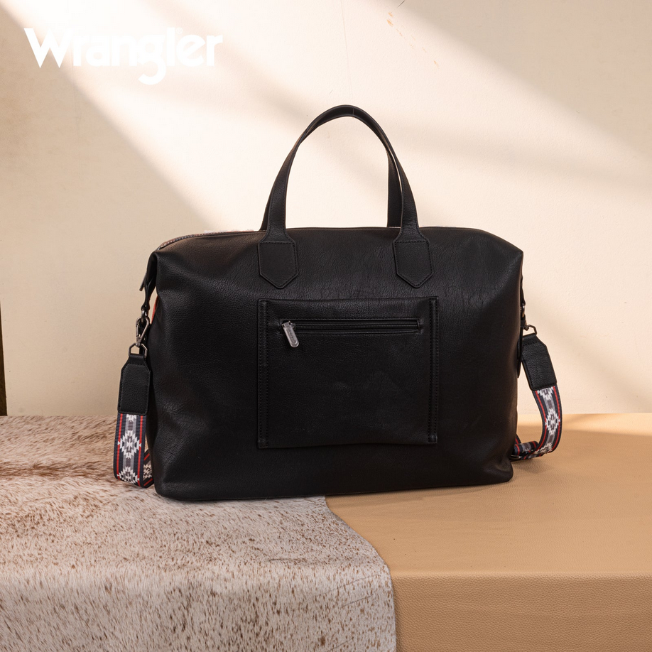 Features: Spacious duffle design; 18"(L) x 7"(W) x 12"(H) with 23" drop; Wrangler signature patch; sturdy hardware; soft yet structured shape