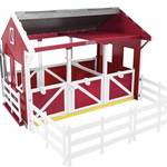 This complete stable includes attached saddle racks and bridle hooks, as well as four pieces of fencing that can create a paddock attached to the barn or used separately.