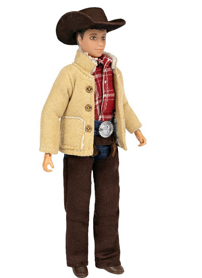 This fully-articulated cowboy figure stands 8" tall and is outfitted in jeans/chaps, a belt with big silver buckle, ranch jacket, and a cowboy hat. Bryce will round out the staff in your Breyer barn and is ready to get to work!