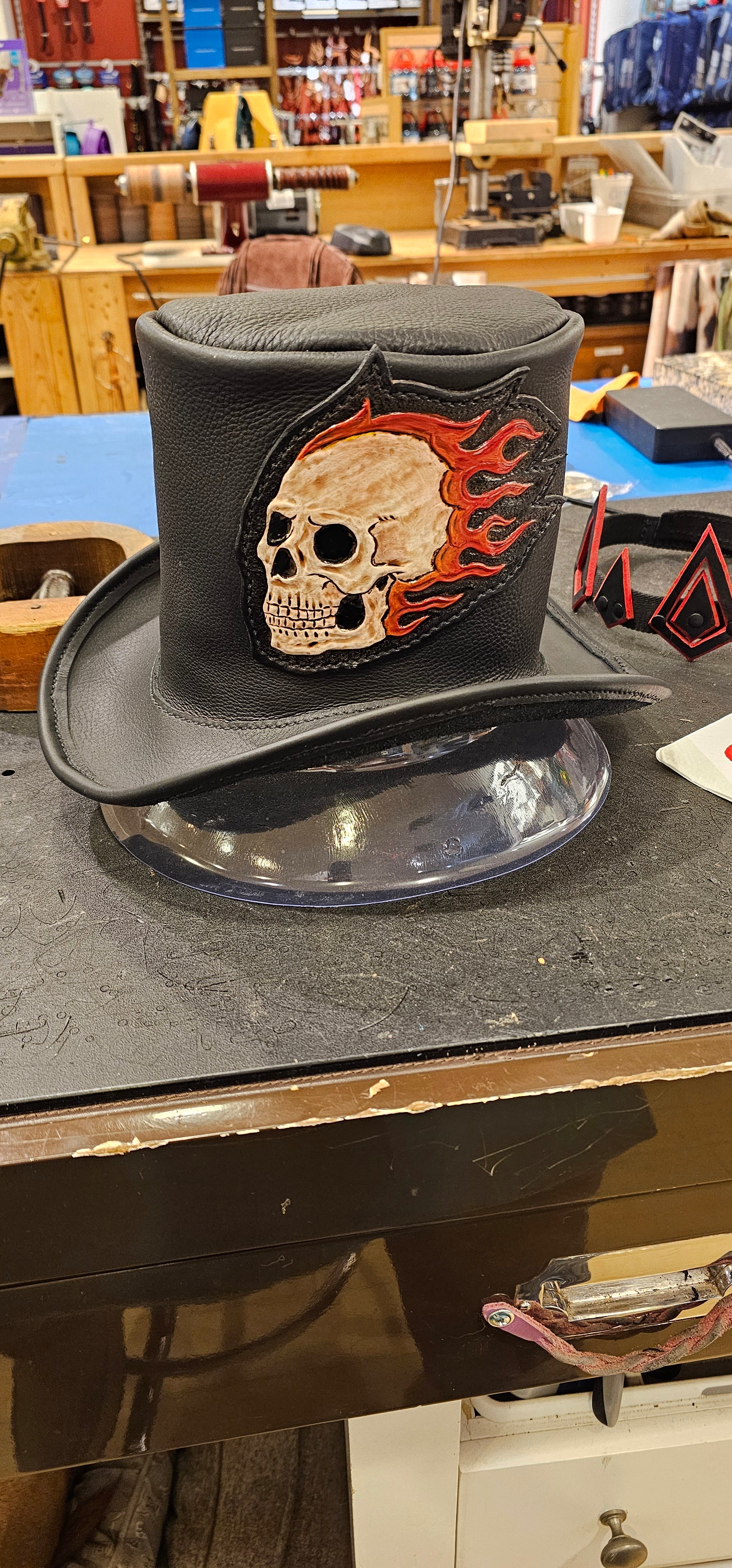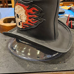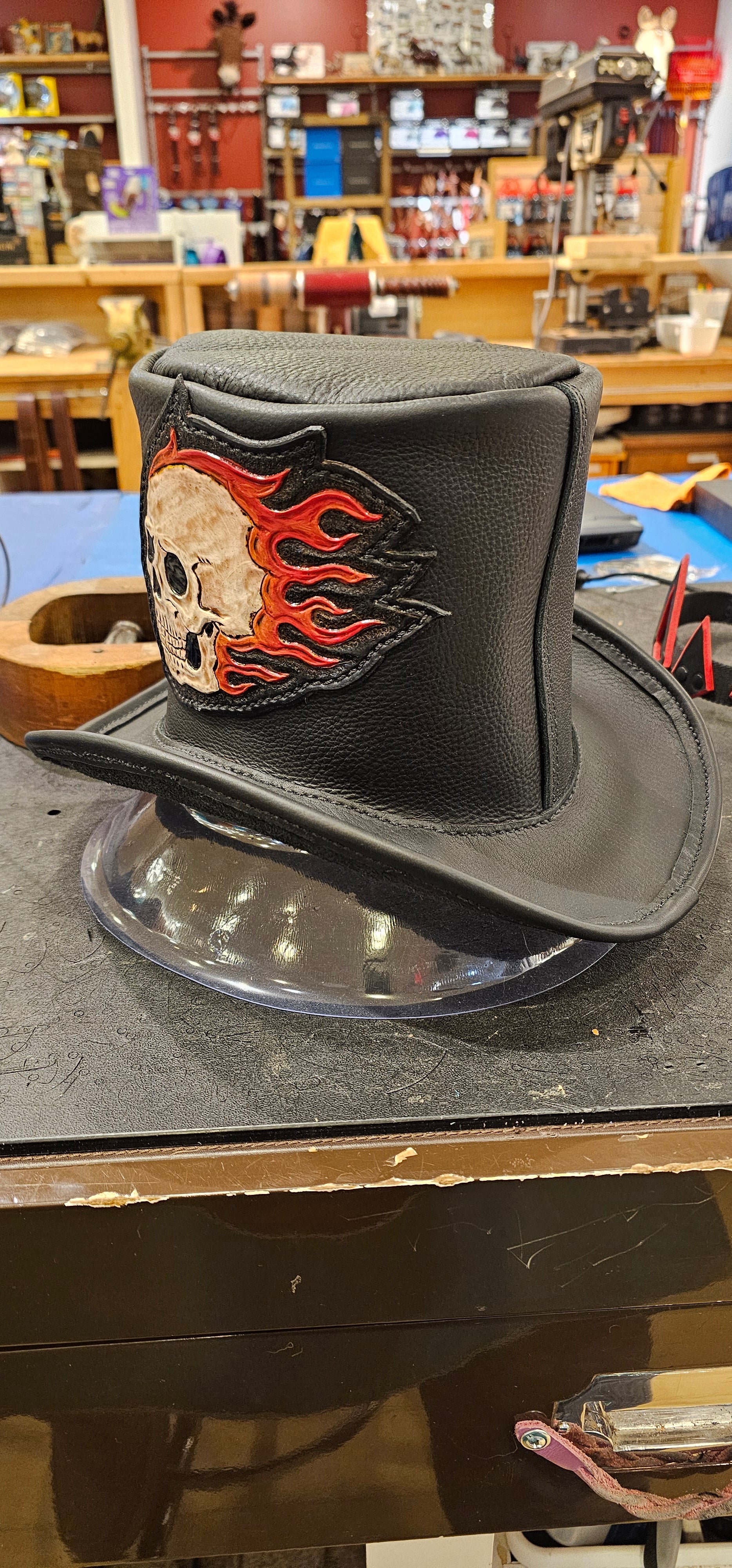 Turn heads with this one-of-a-kind handmade black leather top hat, crafted from premium full-grain leather for lasting quality and bold style. A striking hand-tooled and hand-painted flaming skull adorns the side, giving each hat its own rugged character and artistic detail.