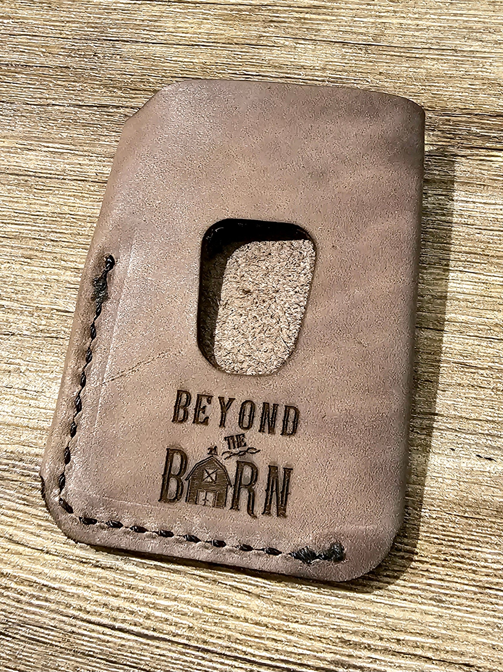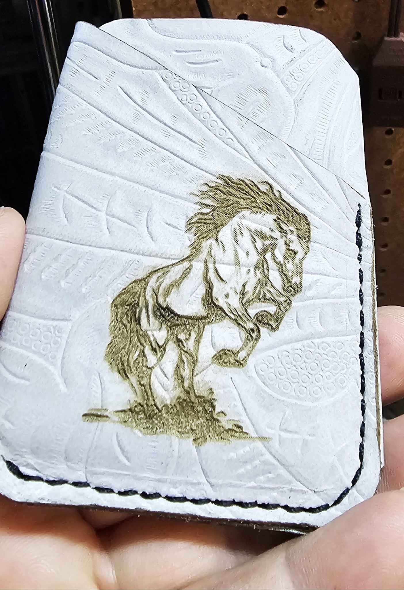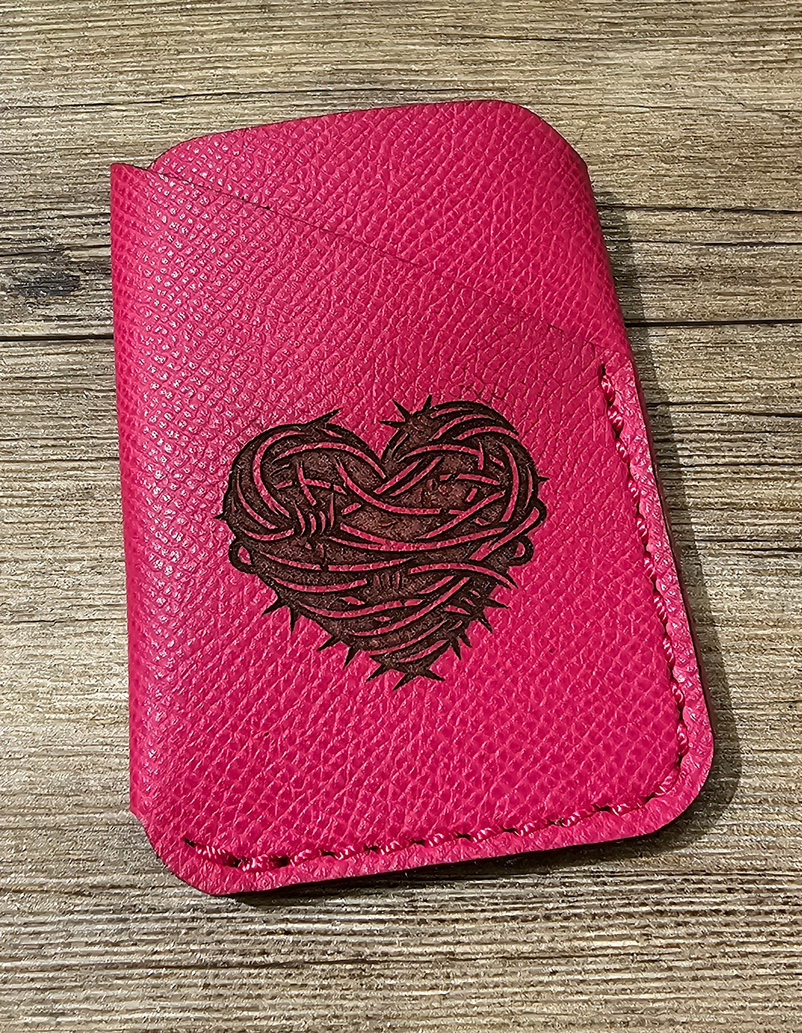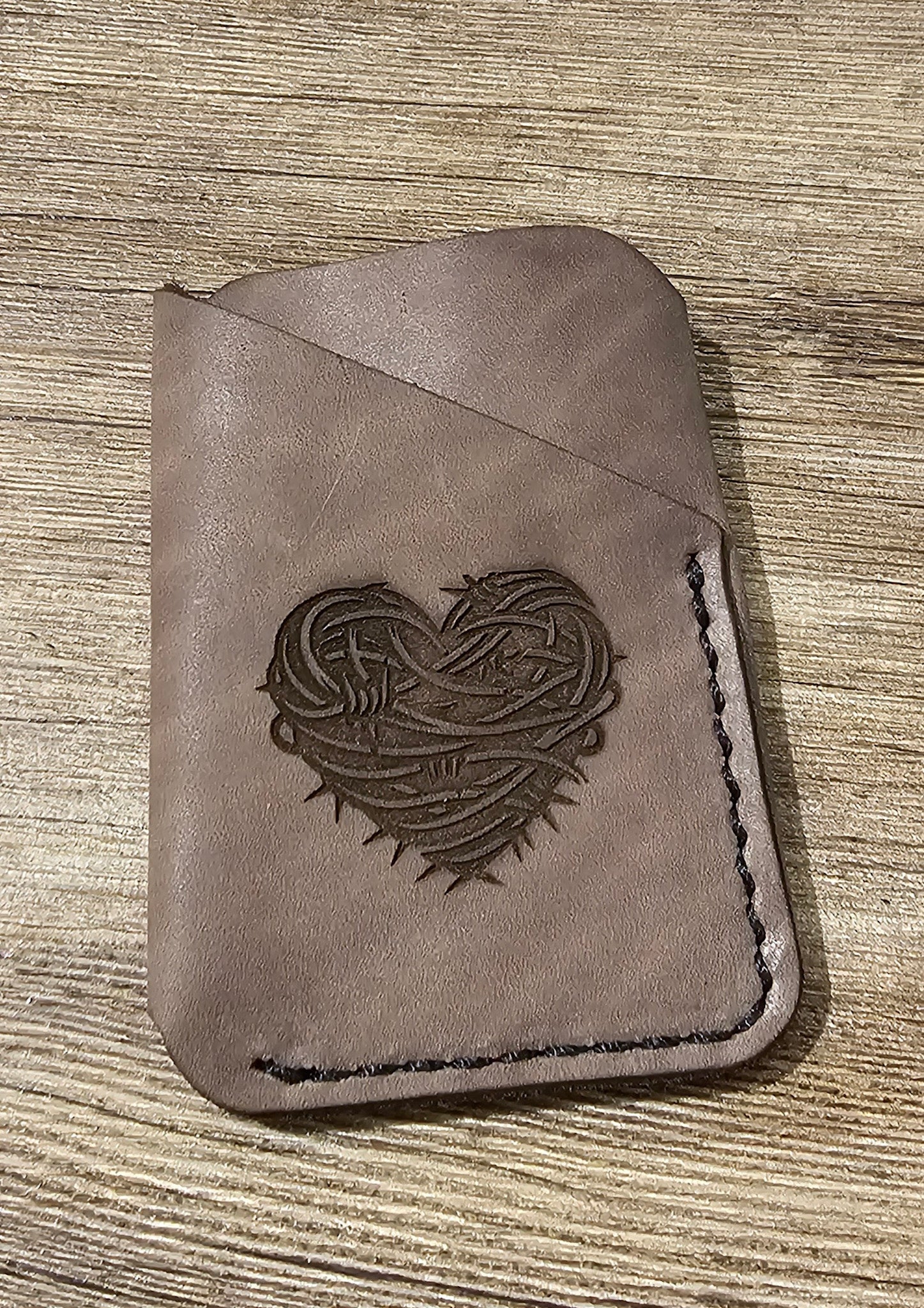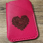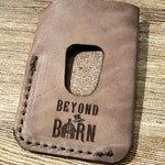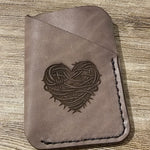 Laser etched leather card wallet. Stock and designs change daily, please call to inquire!