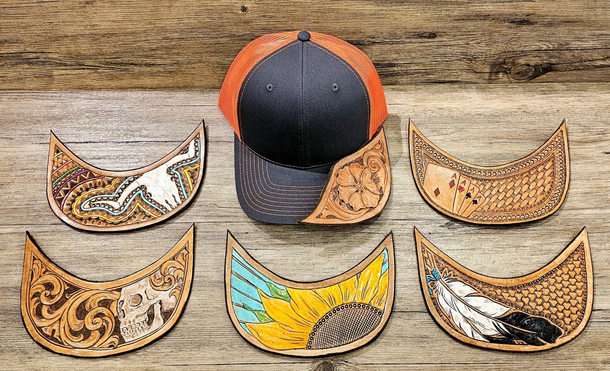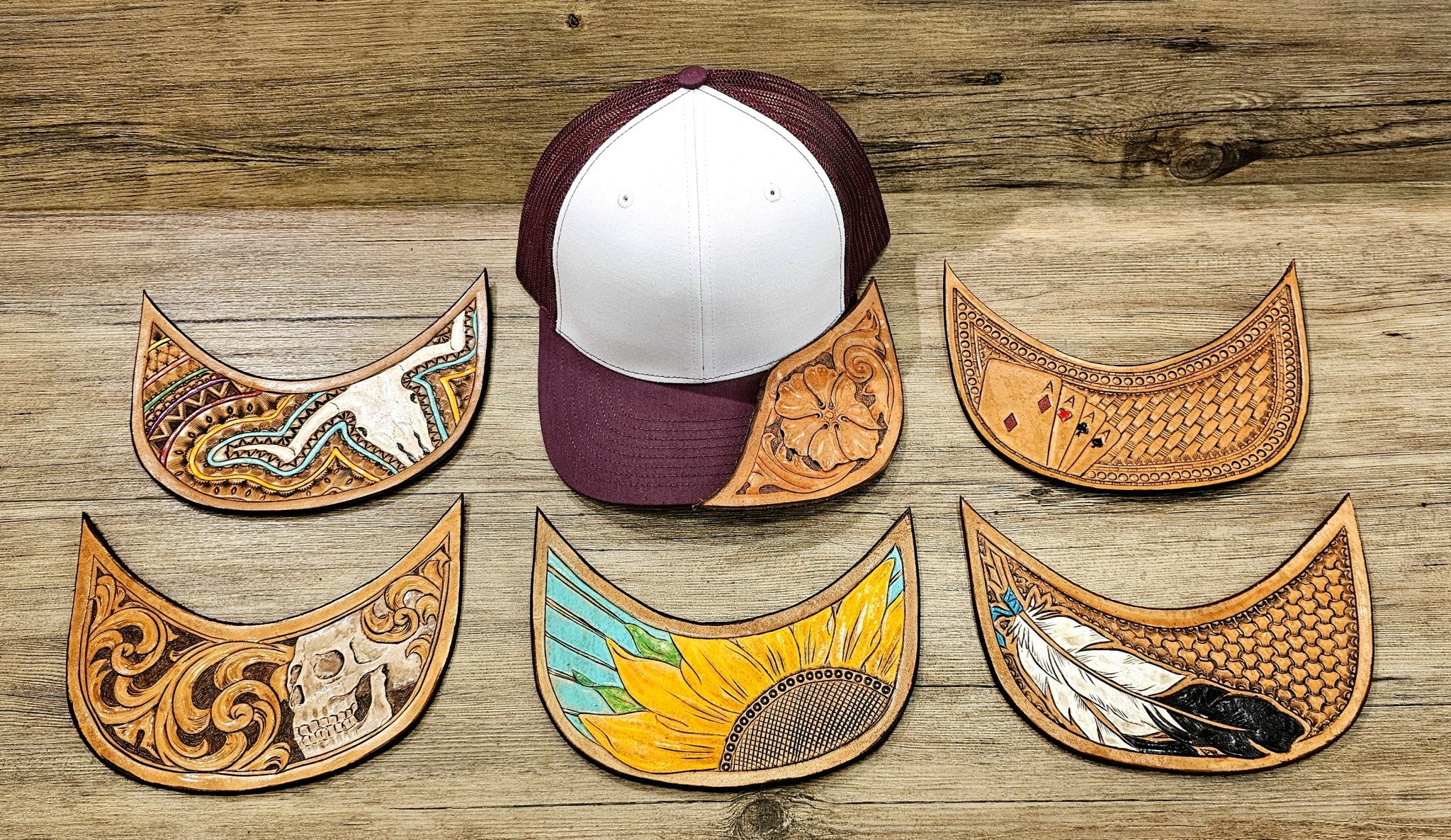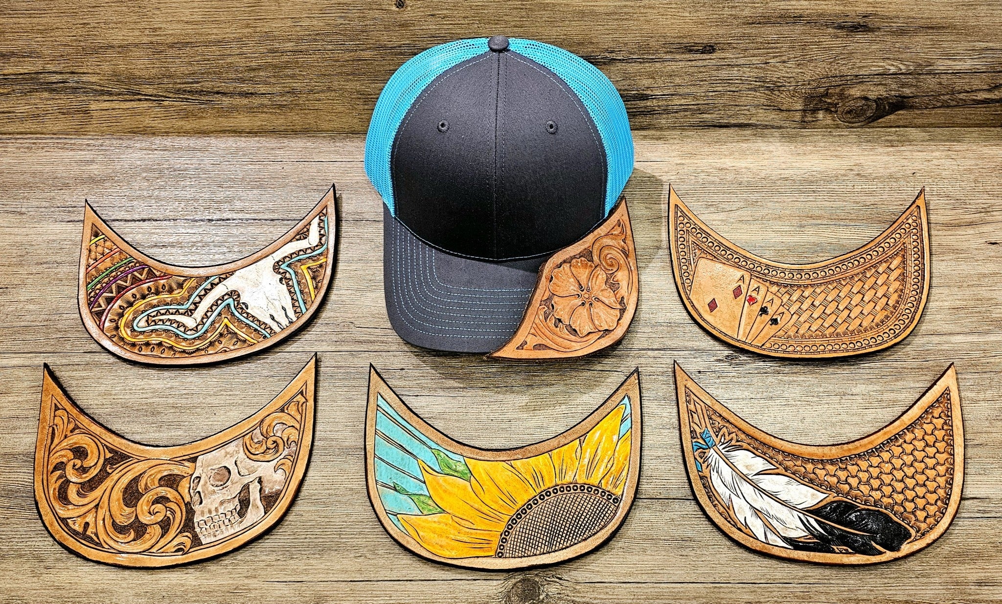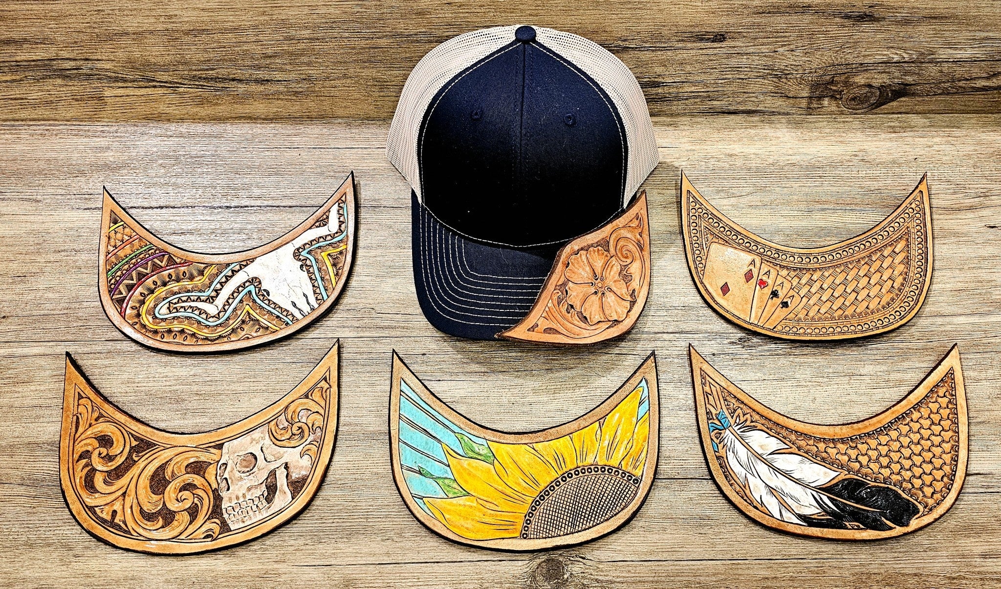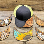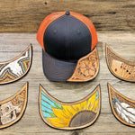 Each cap is unique due to handmade leather tooling