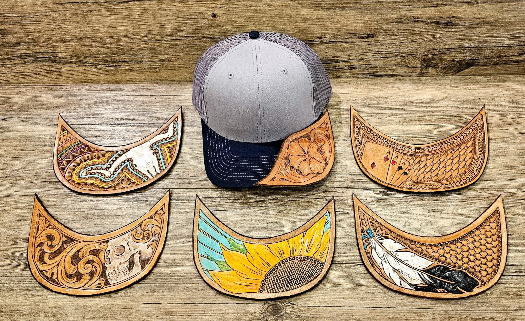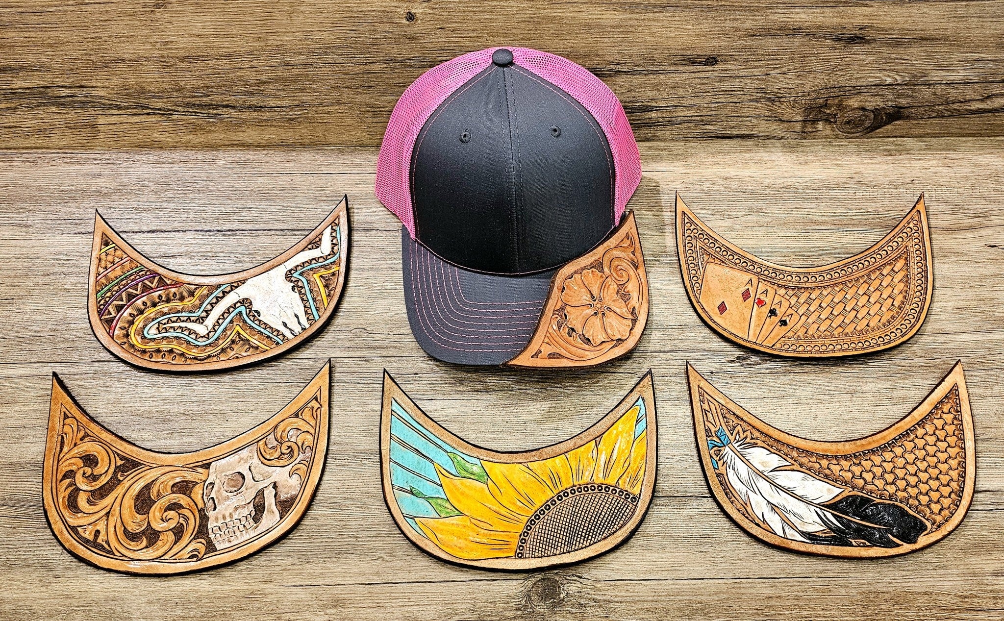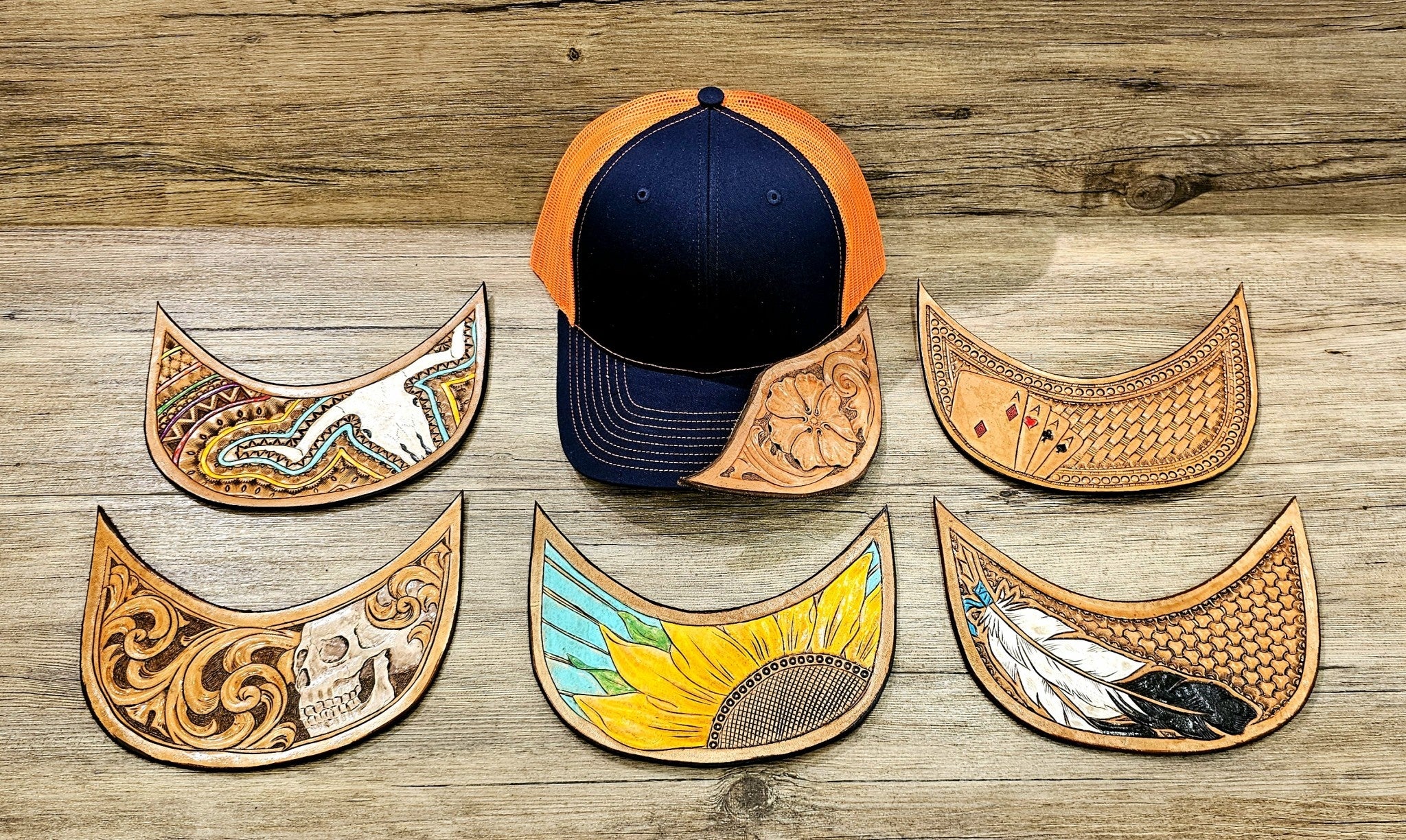 Each cap is unique due to handmade leather tooling