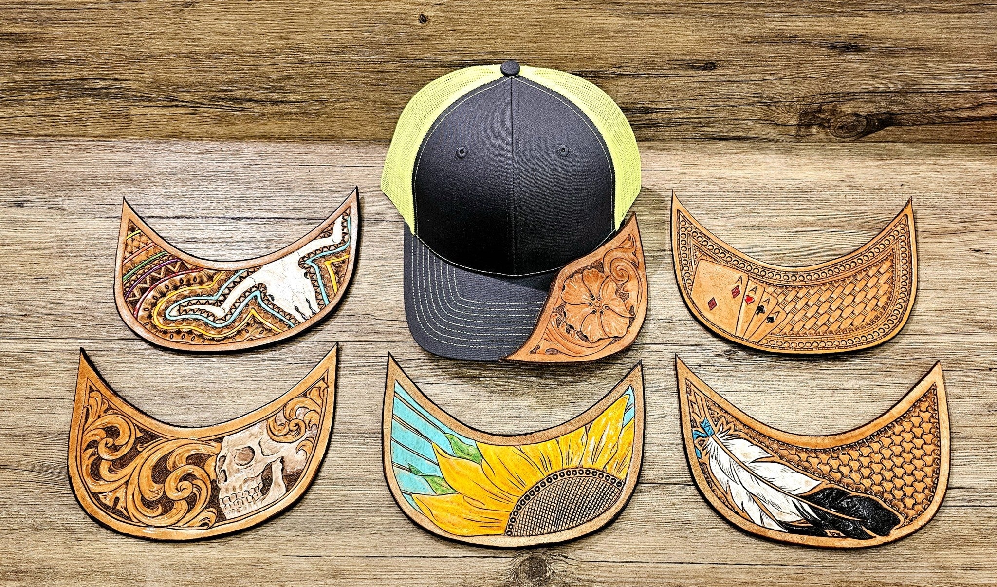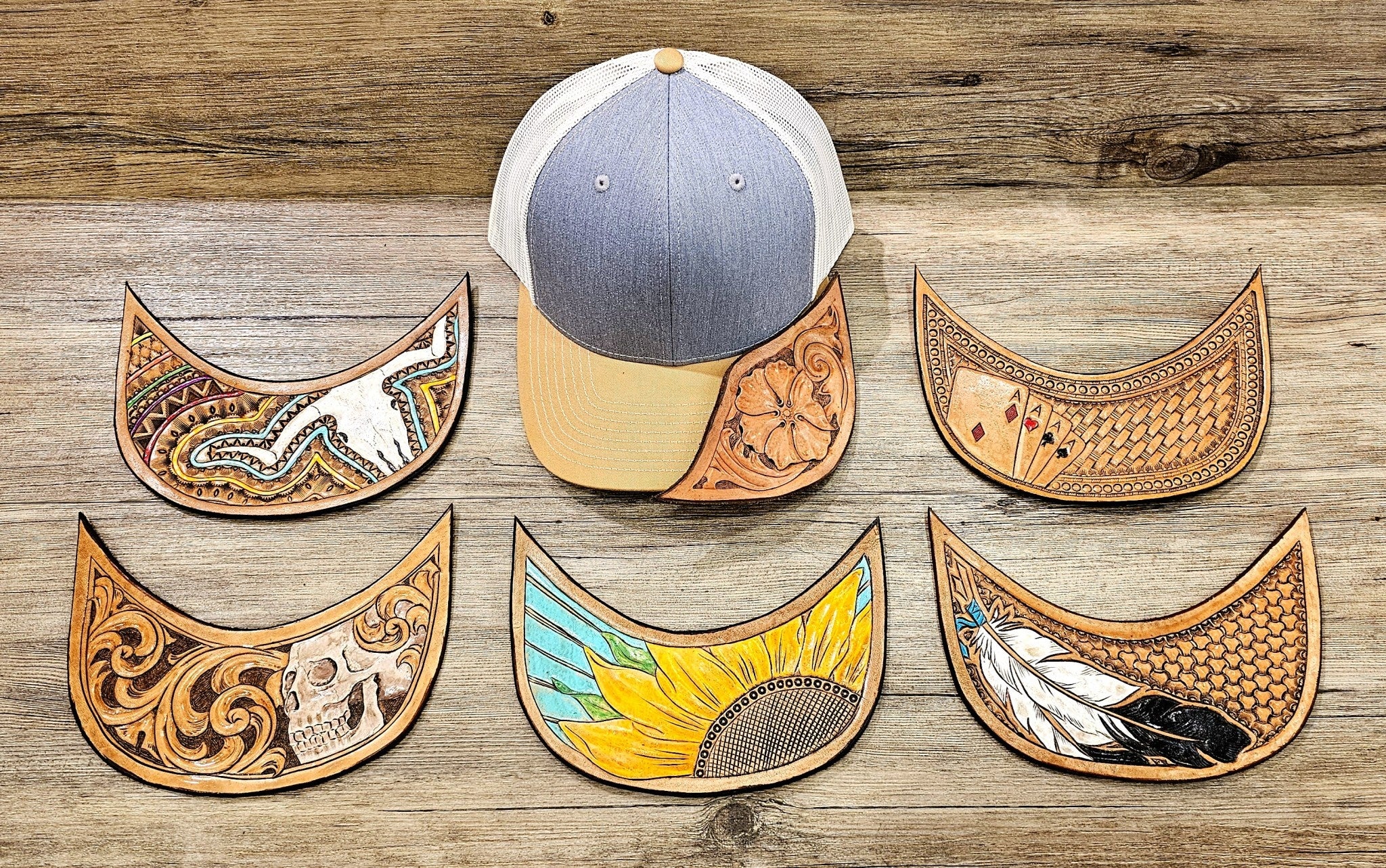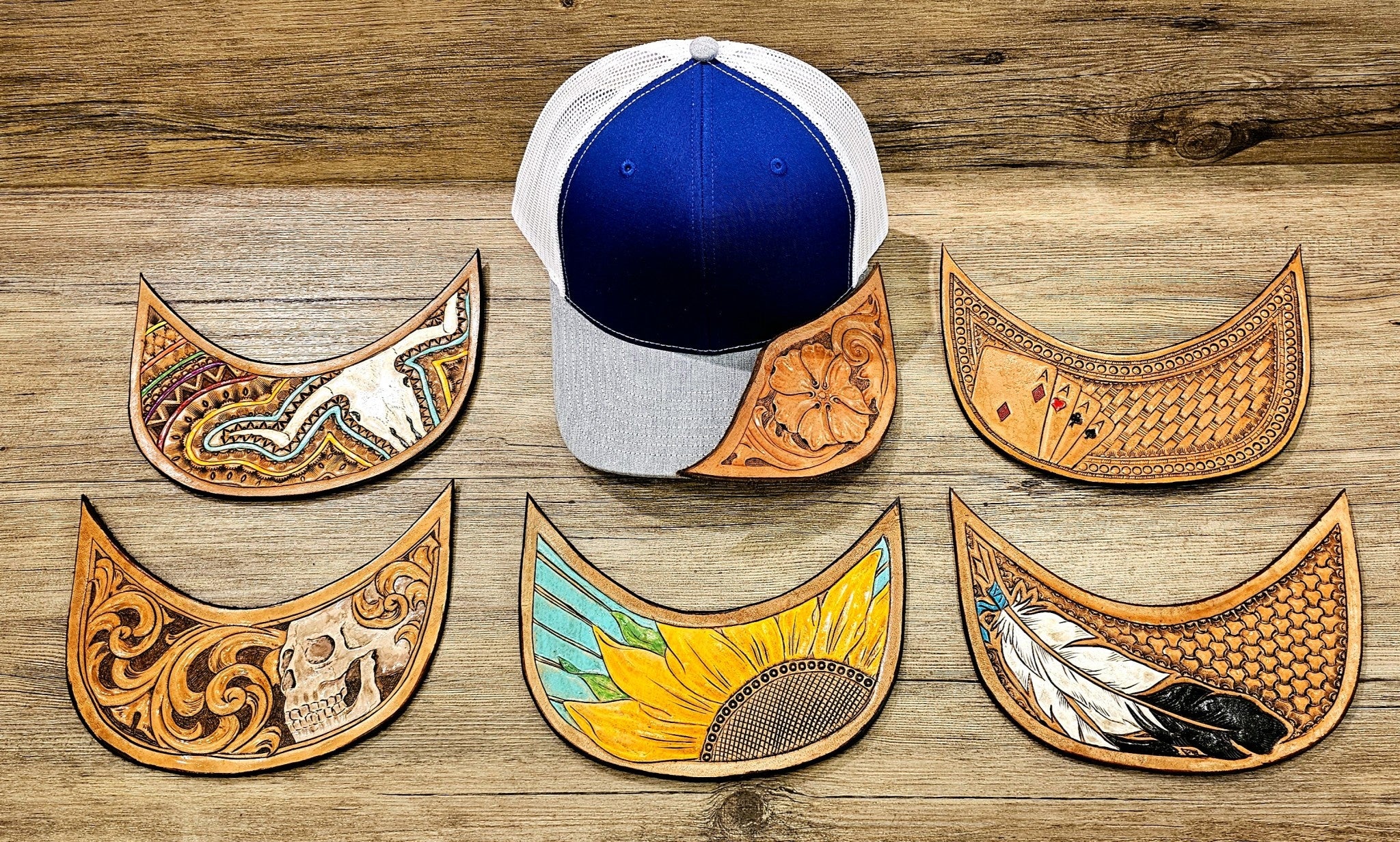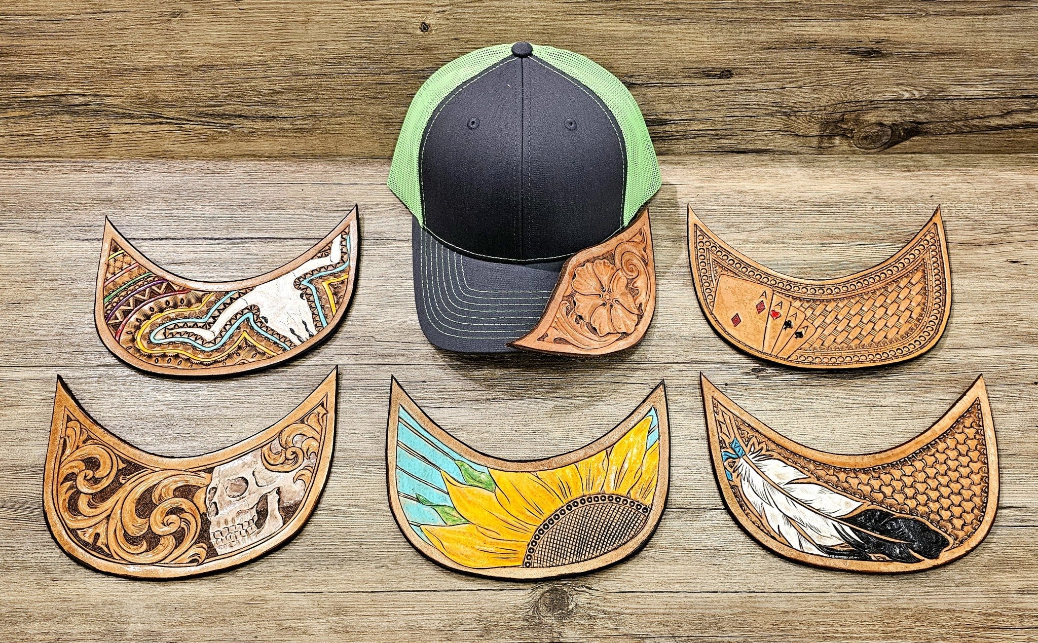 Each cap is unique due to handmade leather tooling