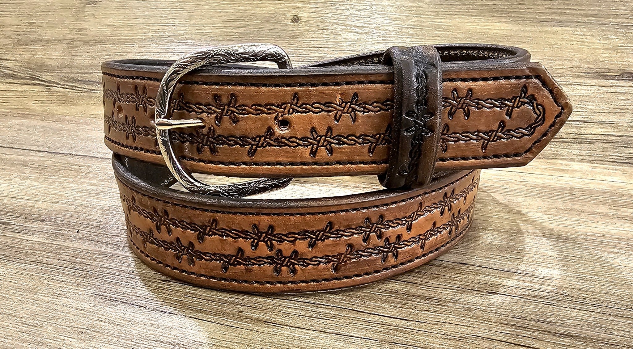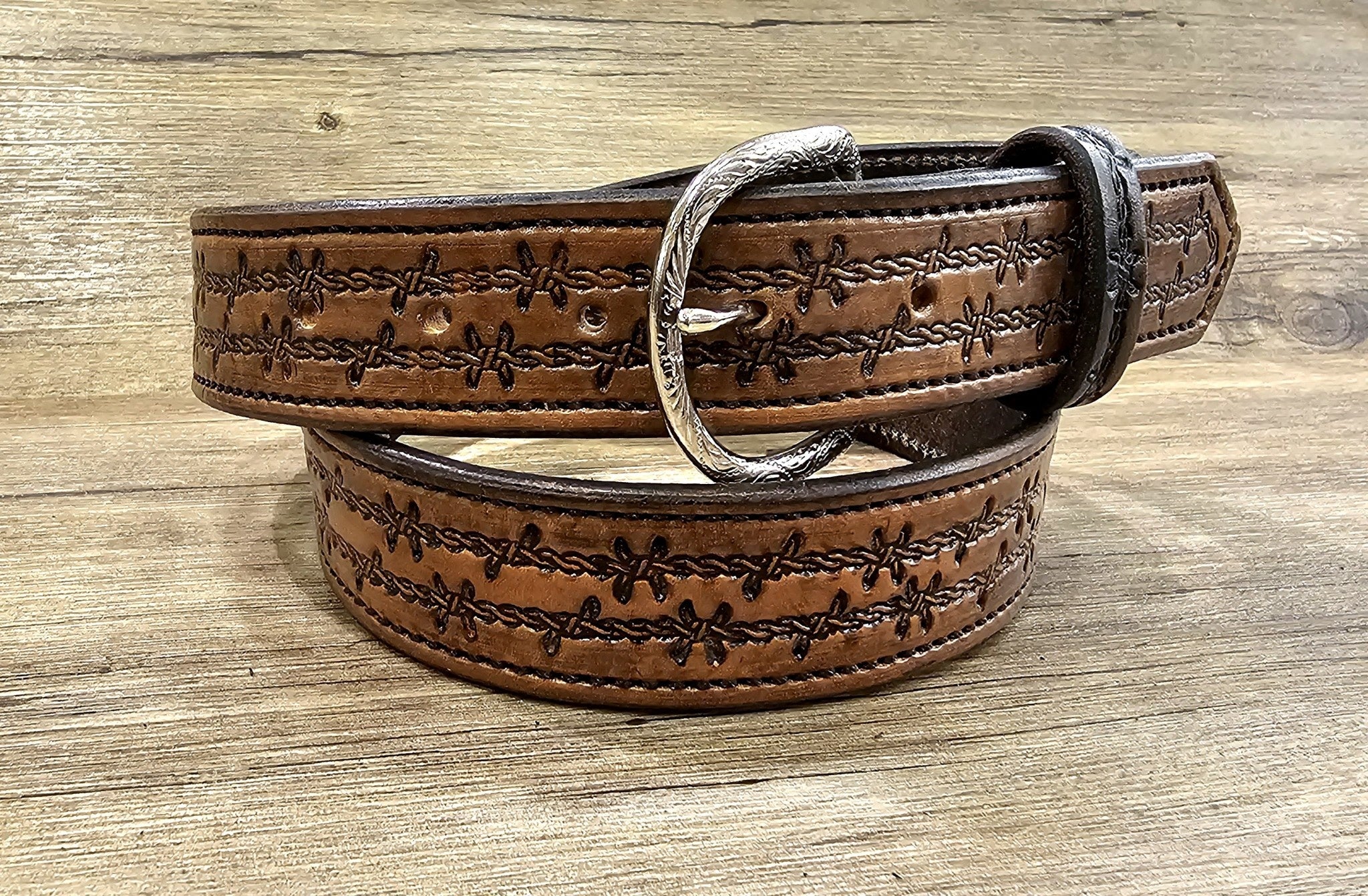 The Beyond the Barn All Leather Barbed Wire Belt BTB is a handcrafted Western belt made in Duluth, MN, featuring full-grain leather with a triumph of hand stamped barbed wire detailing—designed for rugged style and durability.