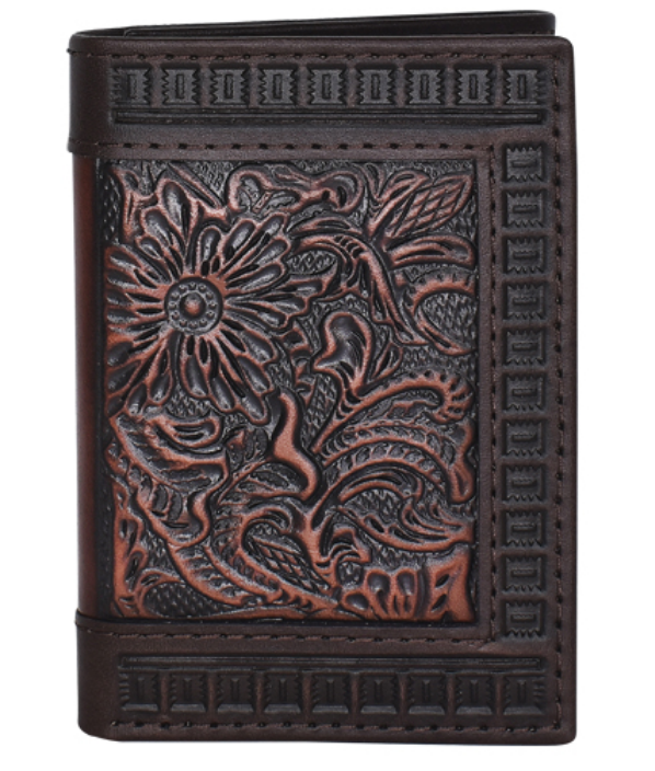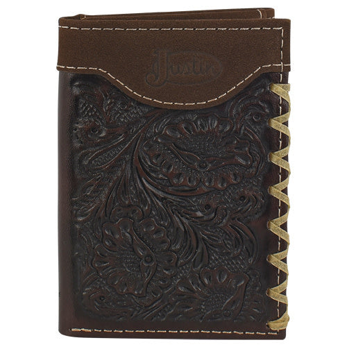 Justin Mens Trifold Wallet Rawhide Edge Stitch and Tooling