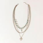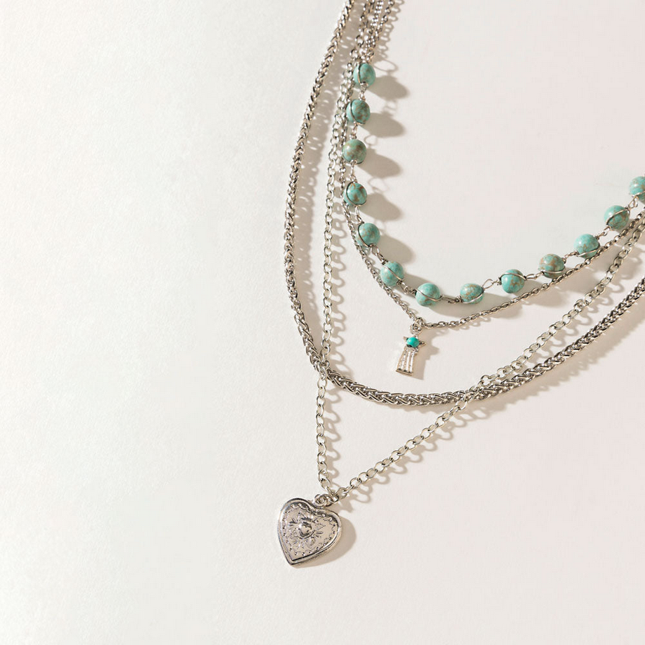 Three softly layered chains fall with effortless drape, mixing turquoise-toned beading, antique silver finish, and charming pendants that shimmer with Western romance. Each strand adds depth and personality, creating a look that feels both rugged and dreamy—perfect for anyone drawn to moonlit desert nights and starlit plains. Wear it as your daily dose of confidence and charm—made for cowgirls who crave a little adventure.