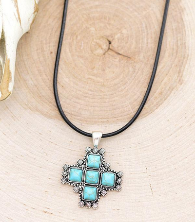 A polished turquoise stone sits at the center of a rustic cross, its veining running like desert rivers through rich blue tones. Antique-style metal framing adds depth and texture, catching the light with a worn western shine that feels both bold and meaningful. Wear it as a reminder of faith carried with strength — steady, grounded, and beautifully rooted in the spirit of the Southwest.