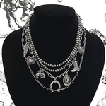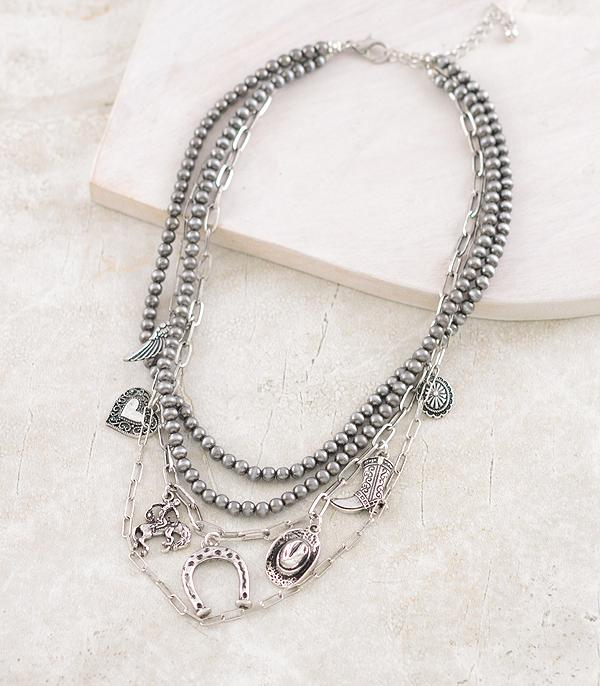 Product Details: Layered necklace featuring western charm accents and Navajo pearl–style beads; approximately 18" length; lobster claw closure with extender hooks; lead & nickel compliant; lightweight and comfortable for everyday wear.