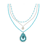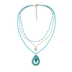 Three beautifully layered strands come alive with a mix of turquoise tones, shimmering silver, and glass beadwork that adds light-catching texture. The striking tribal-inspired pendant anchors the design, offering bold Western flair and artisan character. Wear it as a statement piece that speaks to your free spirit—powerful, earthy, and effortlessly stylish.