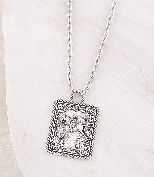 Product Details: Cowgirl pendant necklace; approximately 18" length; pendant measures about 1.4" x 1.7"; lobster claw closure with extender hooks; lead & nickel compliant; lightweight and comfortable for all-day wear.