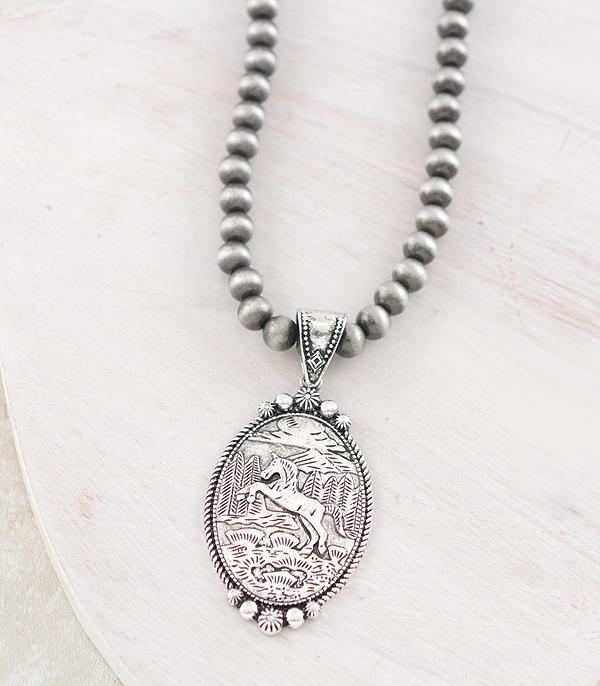 This horse concho necklace brings bold western character with a statement pendant inspired by classic concho styling. The approximate 18" length sits comfortably at the collarbone, while the 2.25" x 1.4" pendant creates a strong focal point without feeling heavy. A standout piece that anchors any western-inspired outfit.