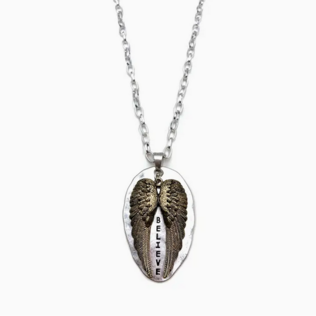 Angel Wings Believe Silver Plate 33" Chain Necklace