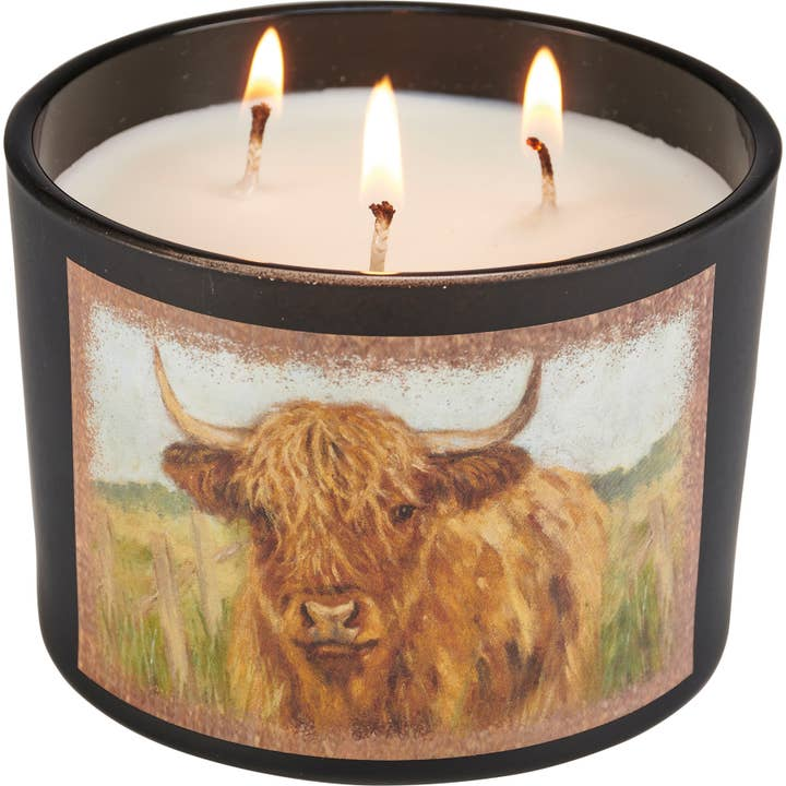 Soy-based wax jar candle; features a double-sided Highland cow design on matte black glass; artwork replicated from original burlap canvas paintings for added depth and texture; scented with Sea Salt & Sage; three fabric wicks for an even burn; approximately 30 hours of burn time; includes dust cover and plastic lid for protection and polished storage; part of the Farmhouse Collection.