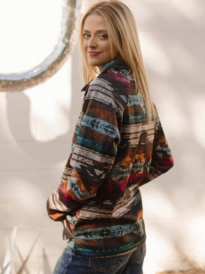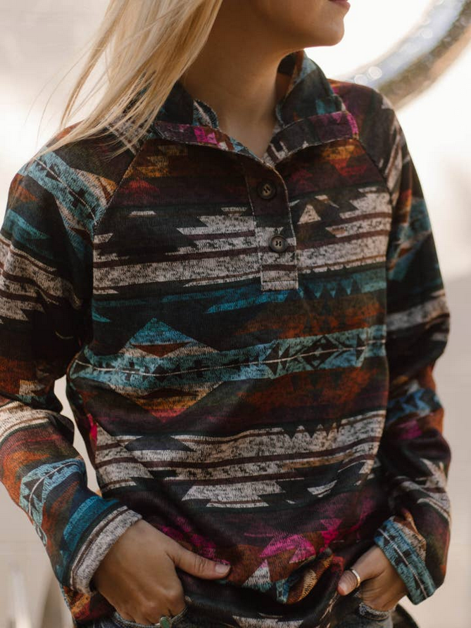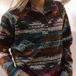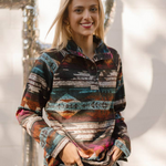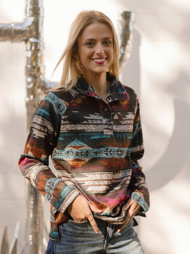 Wrap yourself in cozy warmth and eye-catching Western style with the Mount Whitney Pullover. The soft knitted fabric feels warm and comfortable against the skin, while the bold Aztec pattern adds rich texture and visual interest. Finished with a quarter-button neckline, this pullover blends laid-back comfort with timeless Western charm.
