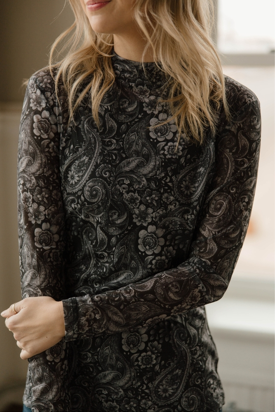 The Wanted In Paisley Mesh Top features a bold black and white paisley print on lightweight, breathable mesh that feels smooth and comfortable against the skin. Designed with stretch for easy movement, it layers effortlessly while still making a statement on its own. This is the kind of piece that adds edgy confidence and standout style to any look.
