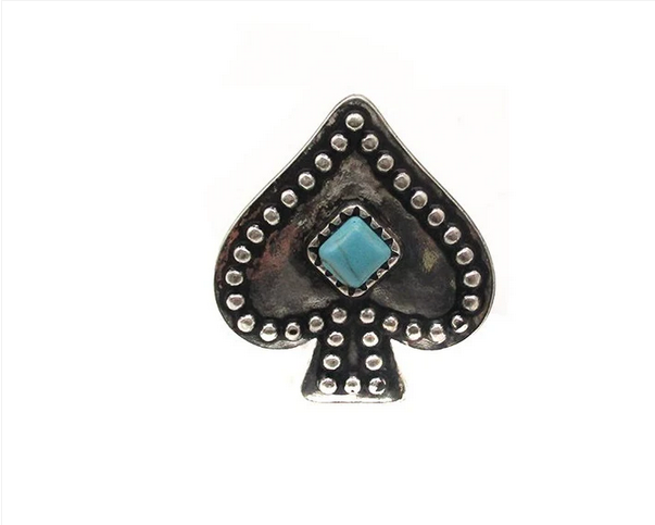 A bold spade-shaped silhouette accented with a turquoise-colored stone gives this cuff ring unmistakable western attitude. The open cuff design adds a modern edge while keeping the look grounded in classic cowgirl style. It’s an easy statement piece that brings character and confidence to any outfit, whether worn solo or stacked with your favorites.