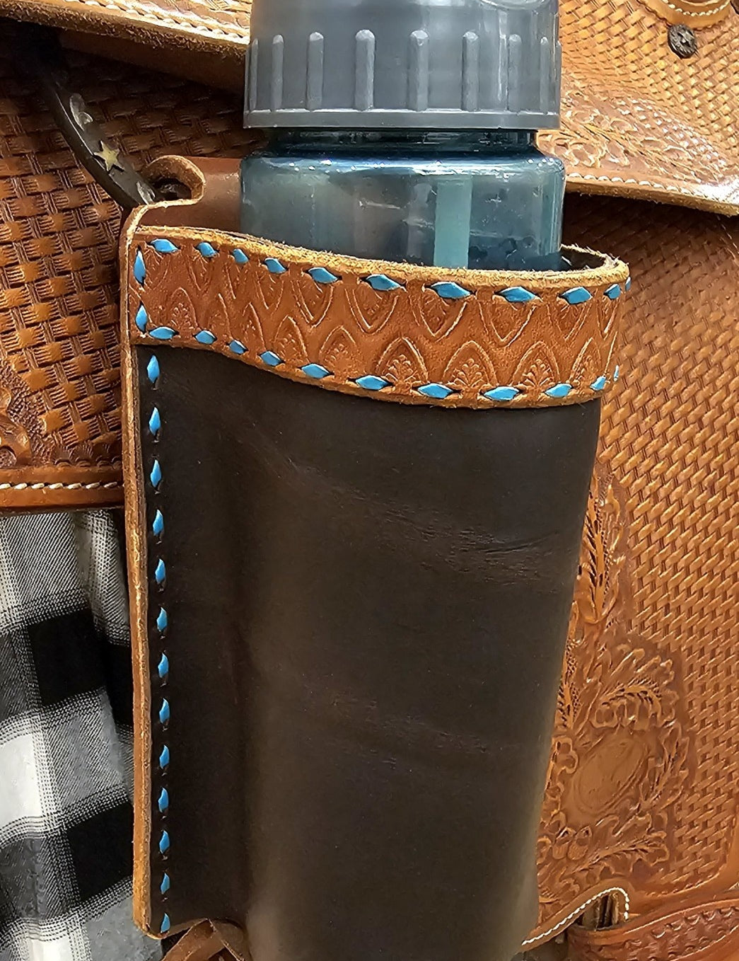Billet Bottle Holder Leather Tooled Buckstitch BTB