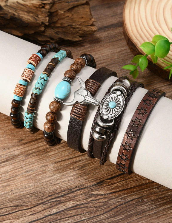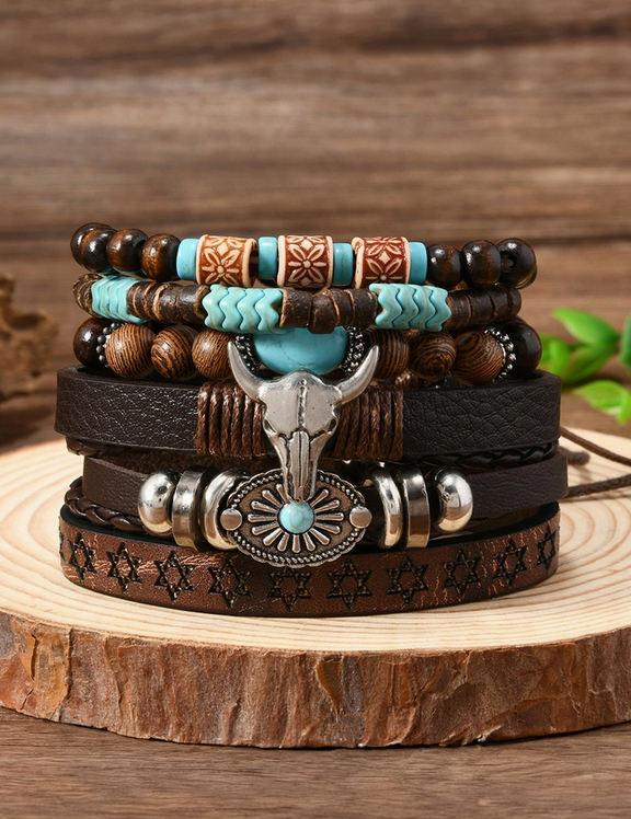 6 Piece Western Bull Skull Turquoise Beading Bracelet