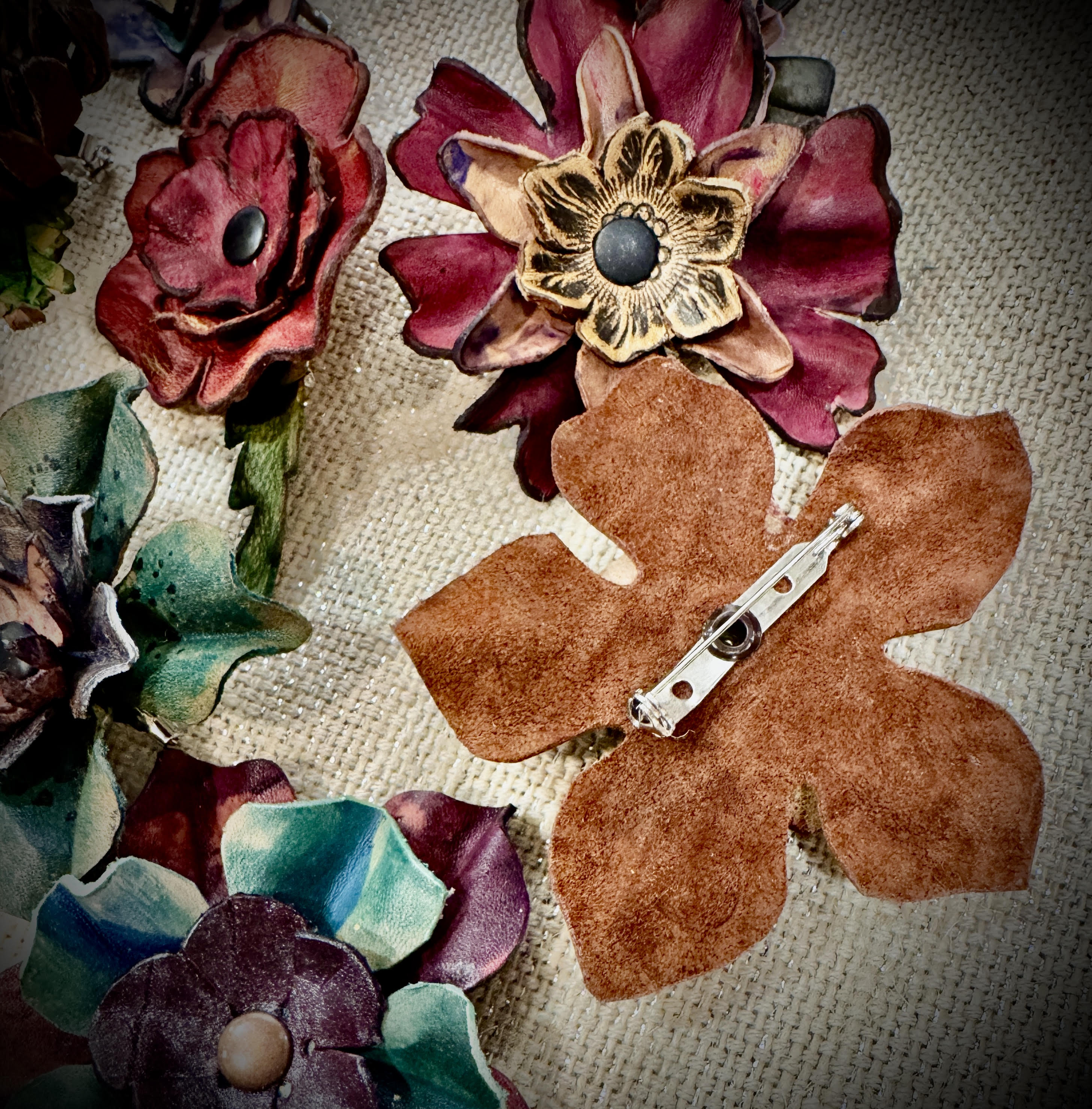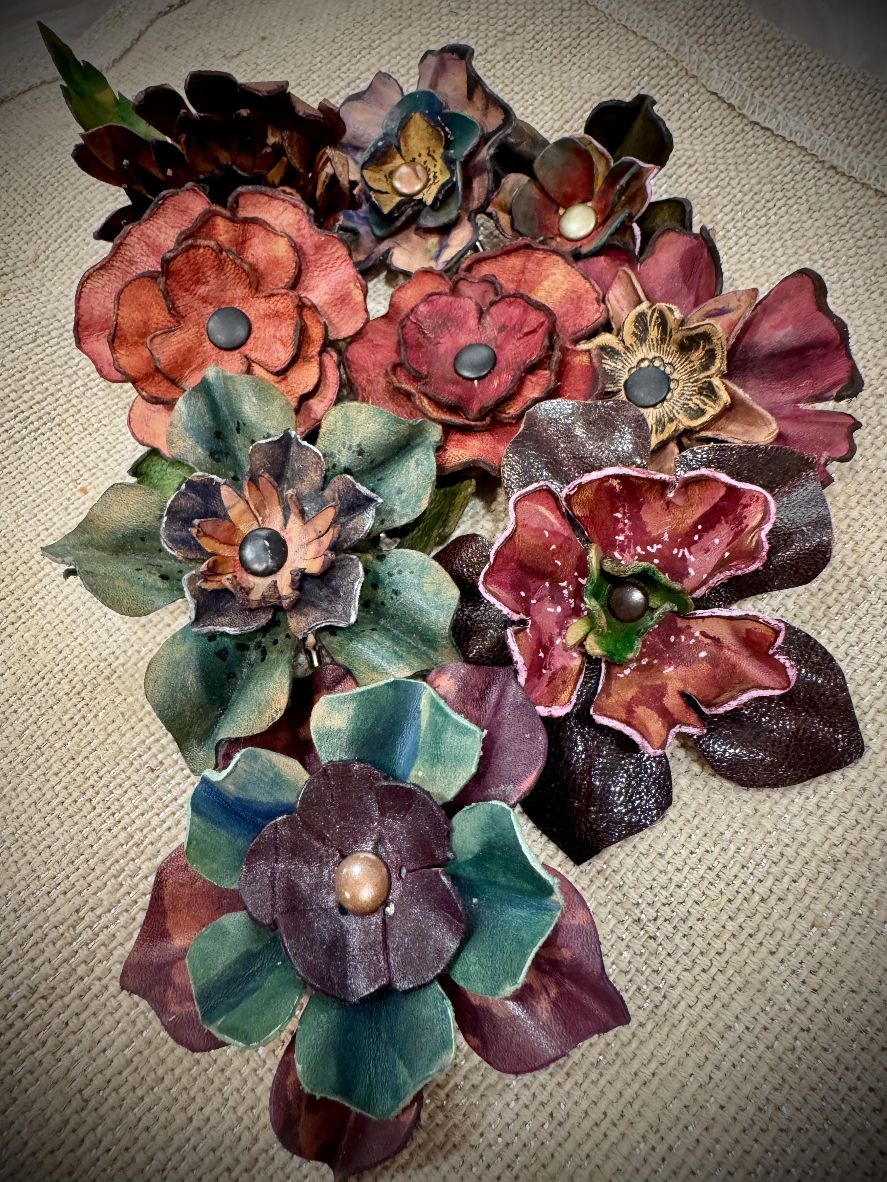 Hand made leather flower pins. Assorted colors and styles, stock changes frequently!