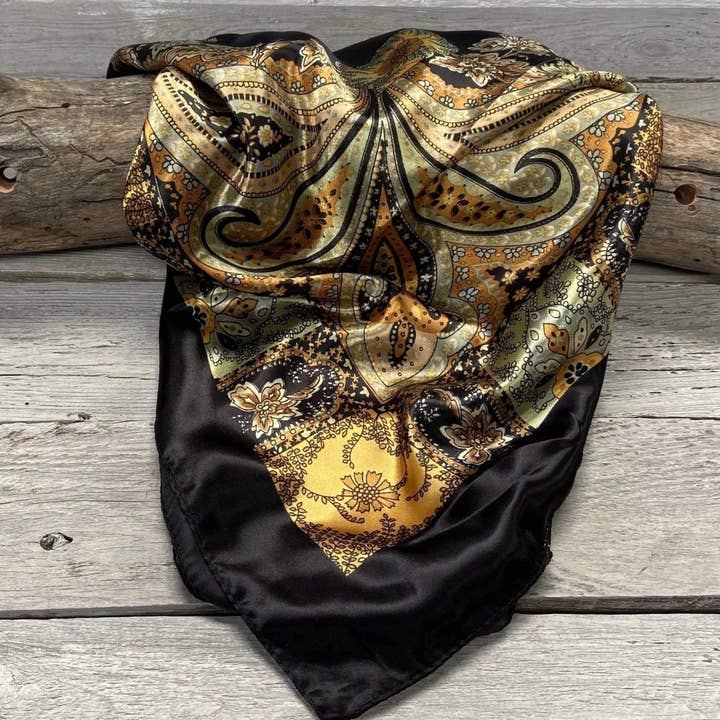Bold golden paisley pops beautifully against a rich black background in this classic wild rag, creating a striking Western look with timeless appeal. The silky-soft fabric drapes smoothly and ties with ease, instantly adding contrast, warmth, and eye-catching style to any outfit. It’s the kind of accessory that makes even the simplest look feel intentional and pulled together.