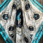 Rich navy blue frames showcase classic gold carriage designs, accented with elegant gold tassels and finished with a bright turquoise border that truly stands out. This silky-soft wild rag drapes beautifully and ties with ease, adding bold color, movement, and Western-inspired elegance to any outfit. It’s a statement accessory that brings timeless charm with a vibrant twist.