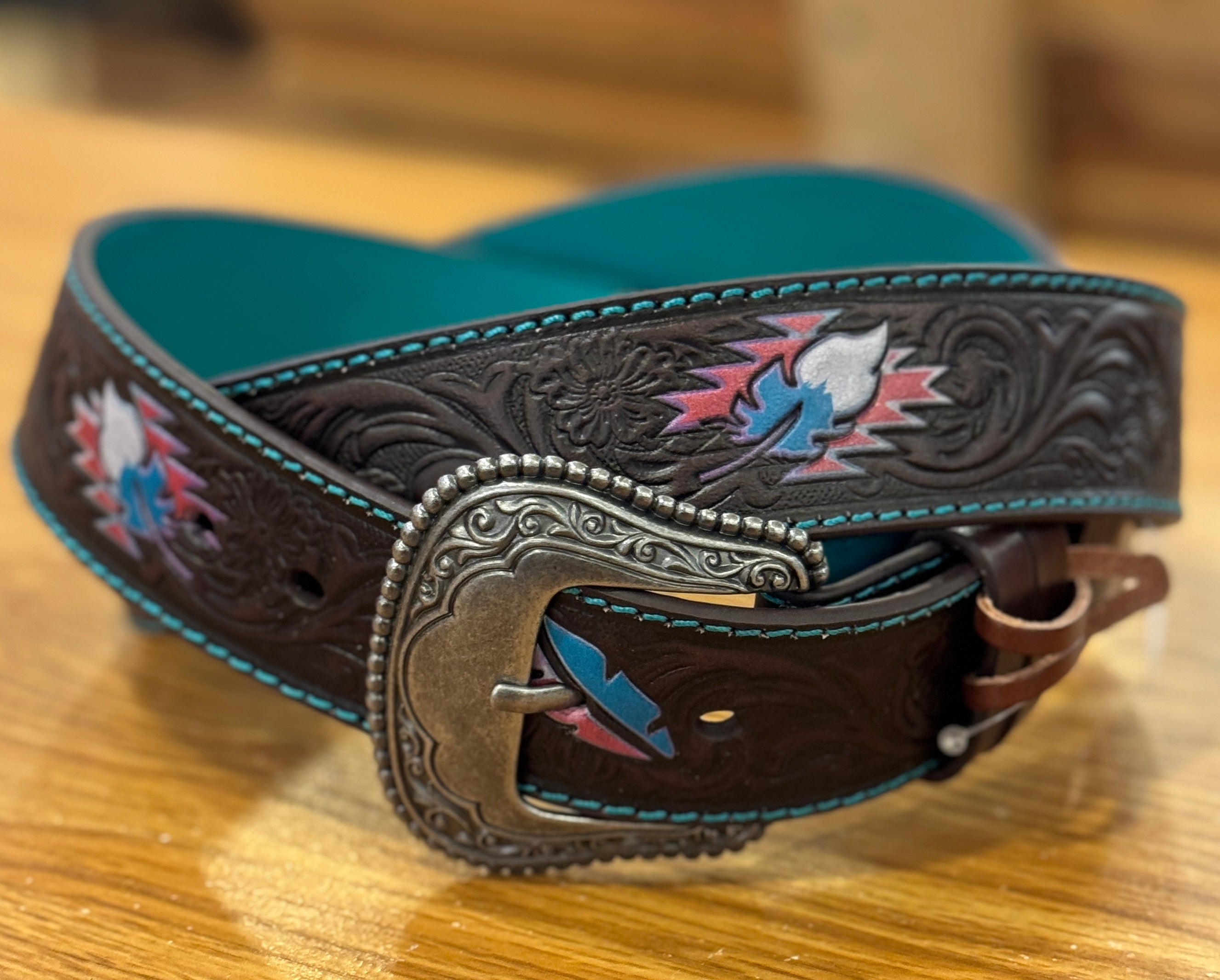 Womens Catchfly Leather Belt w/Colored Feathers