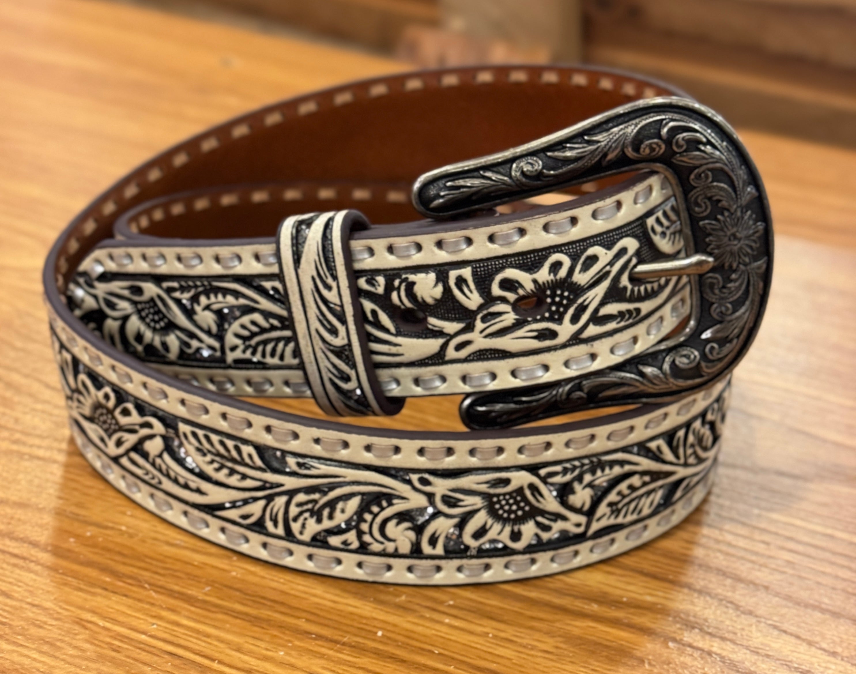 Ariat Ladies Belt White Pierced Silver Glitter Underlay