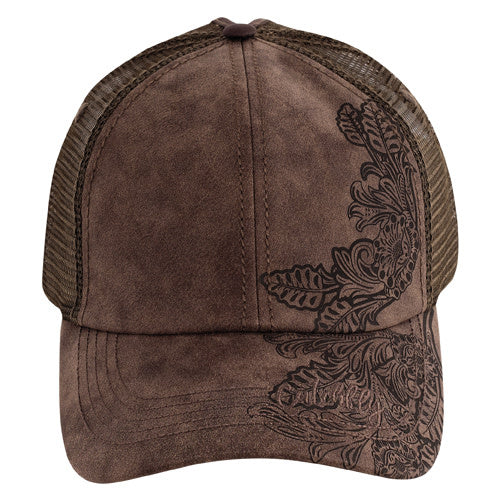 WOMEN'S CATCHFLY PONYTAIL BASEBALL CAP WITH EMBROIDERED DESIGN AND TONAL STITCHING