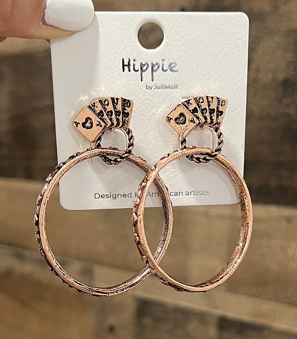Polished silver tones paired with bold ace card details give these hoop earrings standout Western style you can see and feel. The playing card accent adds a fun touch of luck and attitude, while the classic hoop silhouette keeps the look timeless and easy to wear.