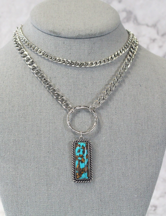 Two - Layered Silver Chain Turq Stone Necklace
