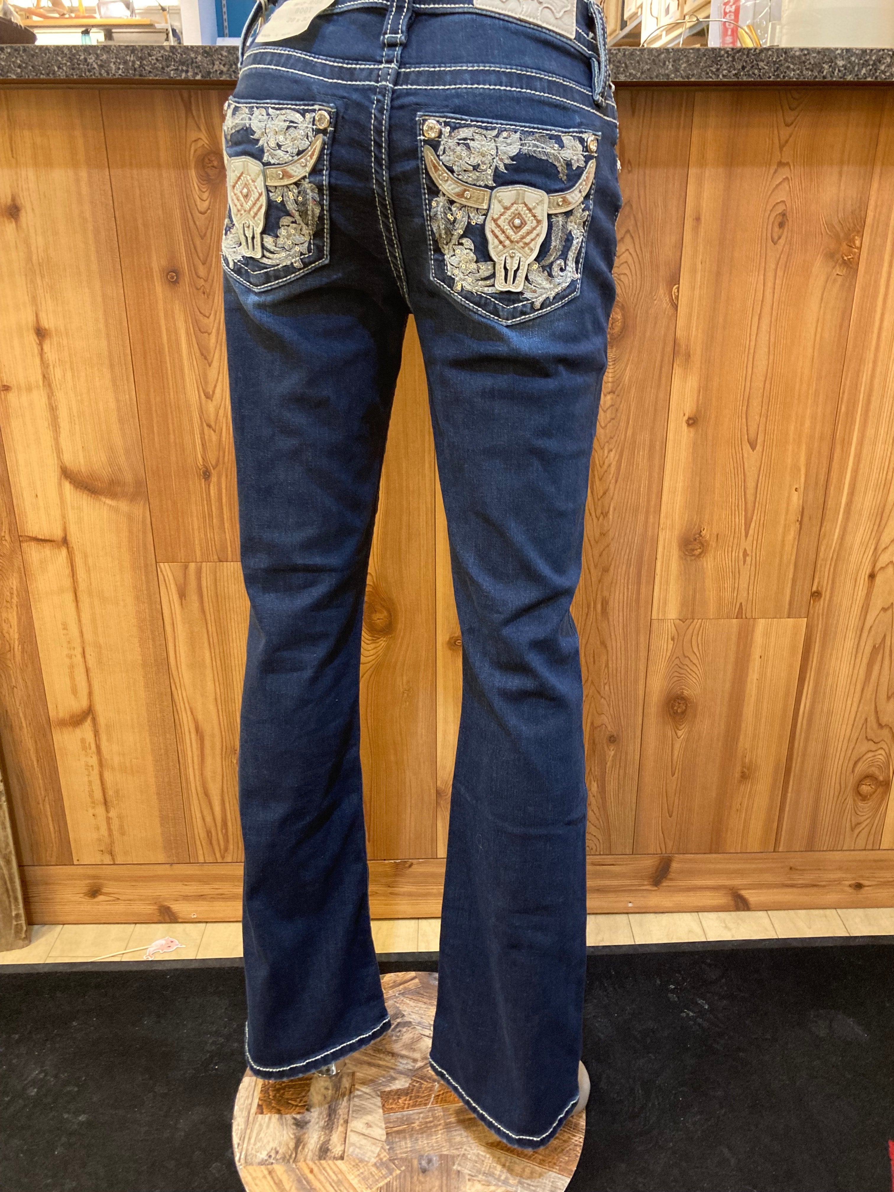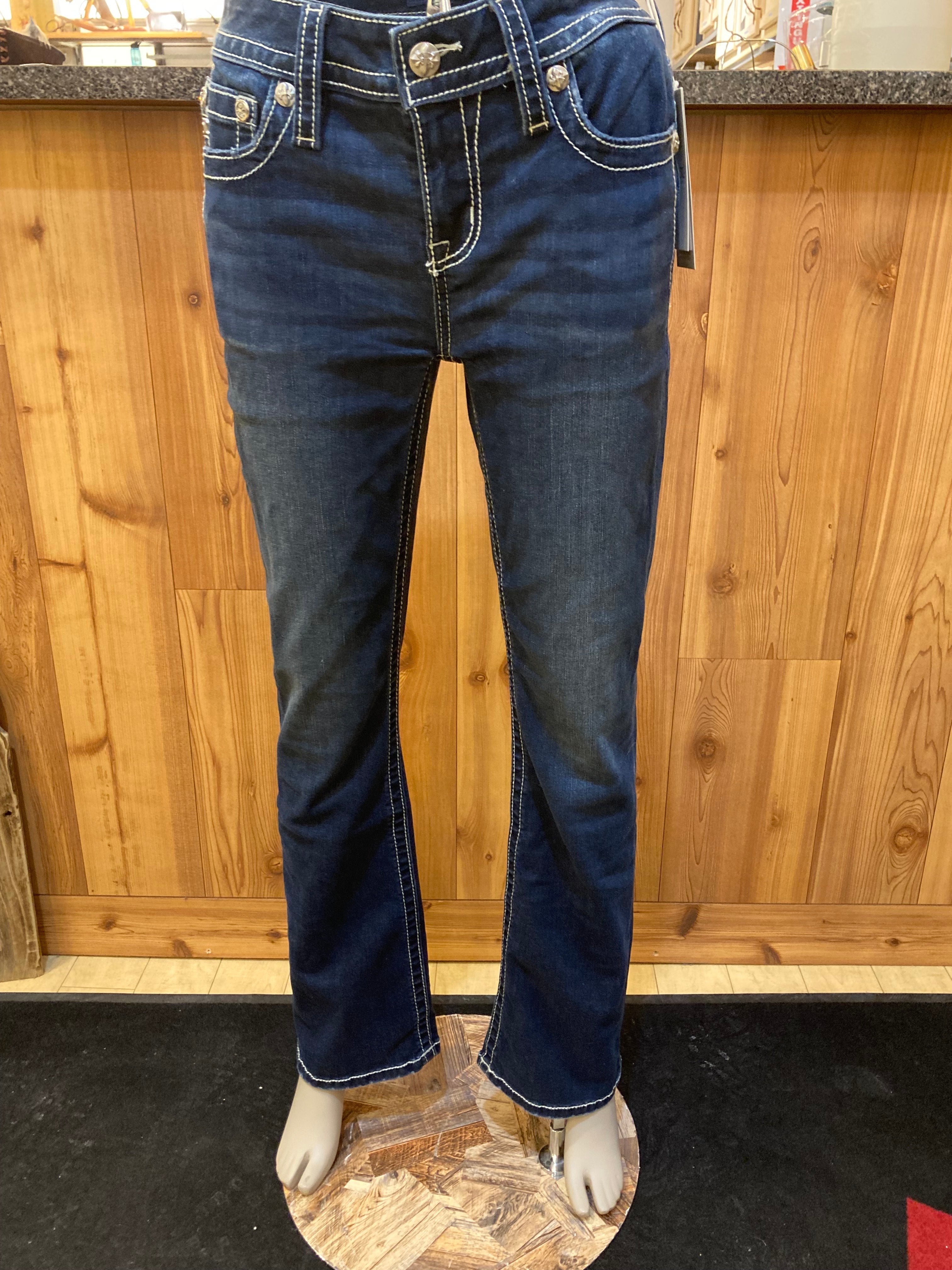 Miss Me women’s denim jeans; mid rise; boot cut leg opening; dark wash; classic five-pocket styling; button and zip fly.