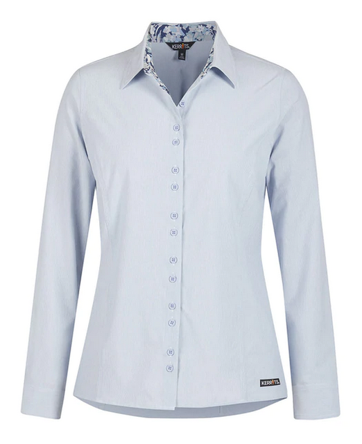 - Femininely tailored with princess seams and a printed inner placket and cuff
