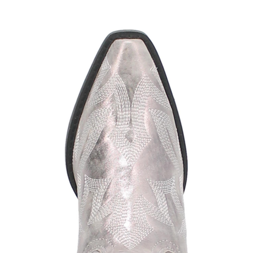 Dazzle in a brilliant metallic finish that catches every light—these Silver Dream Girl boots pair shimmering style with classic western structure, so they feel just as at home on a dance floor as they do at a rodeo. The smooth, polished leather and detailed embroidery create a luxe, standout look, while the supportive build keeps each step secure and confident.